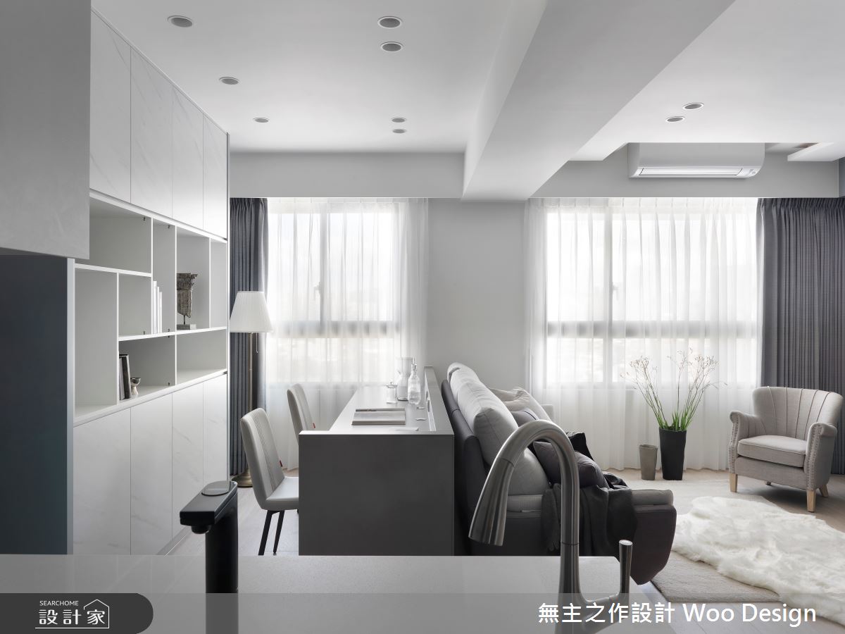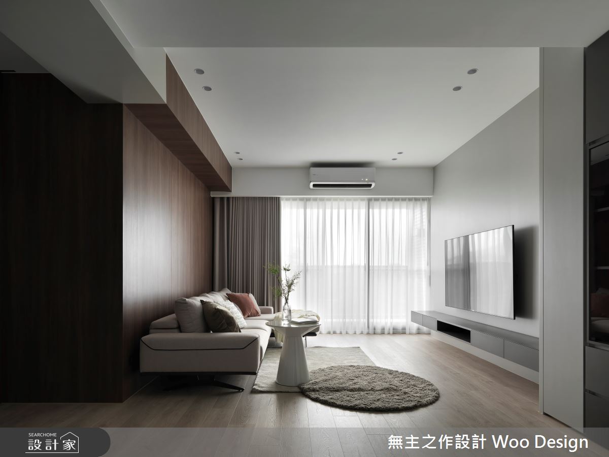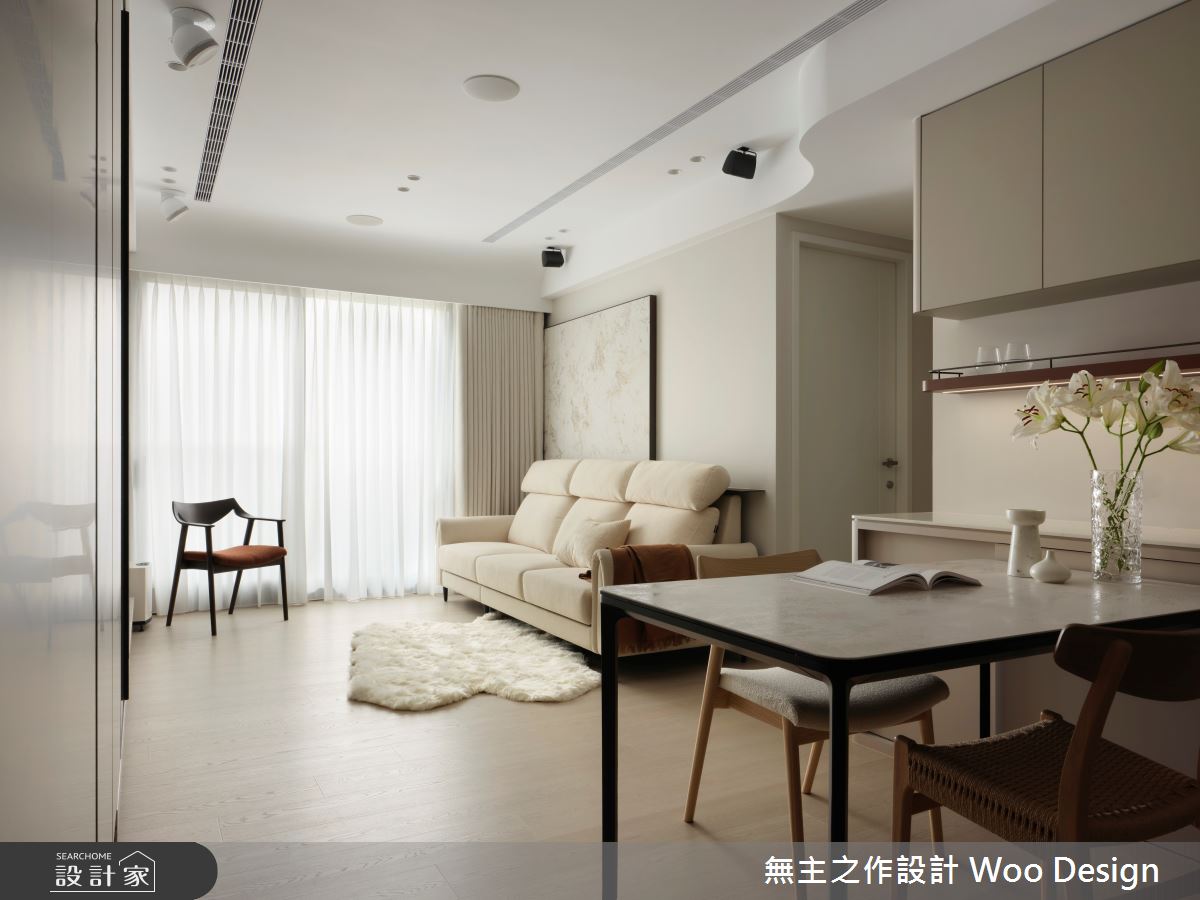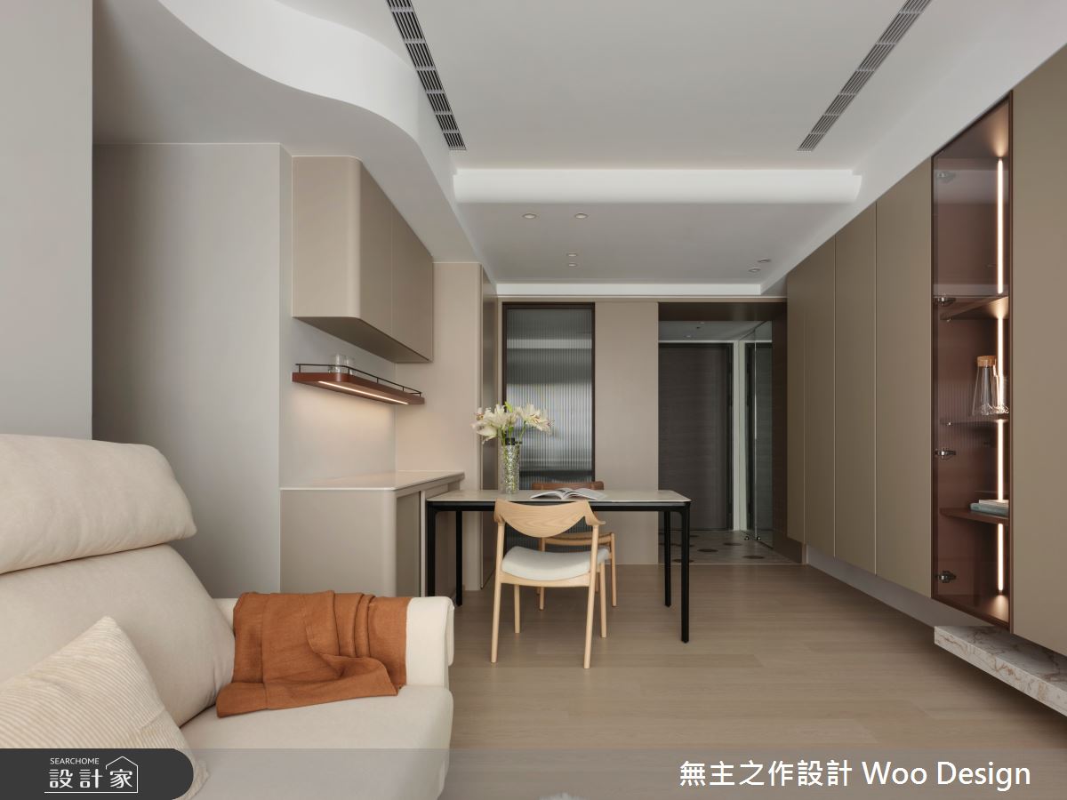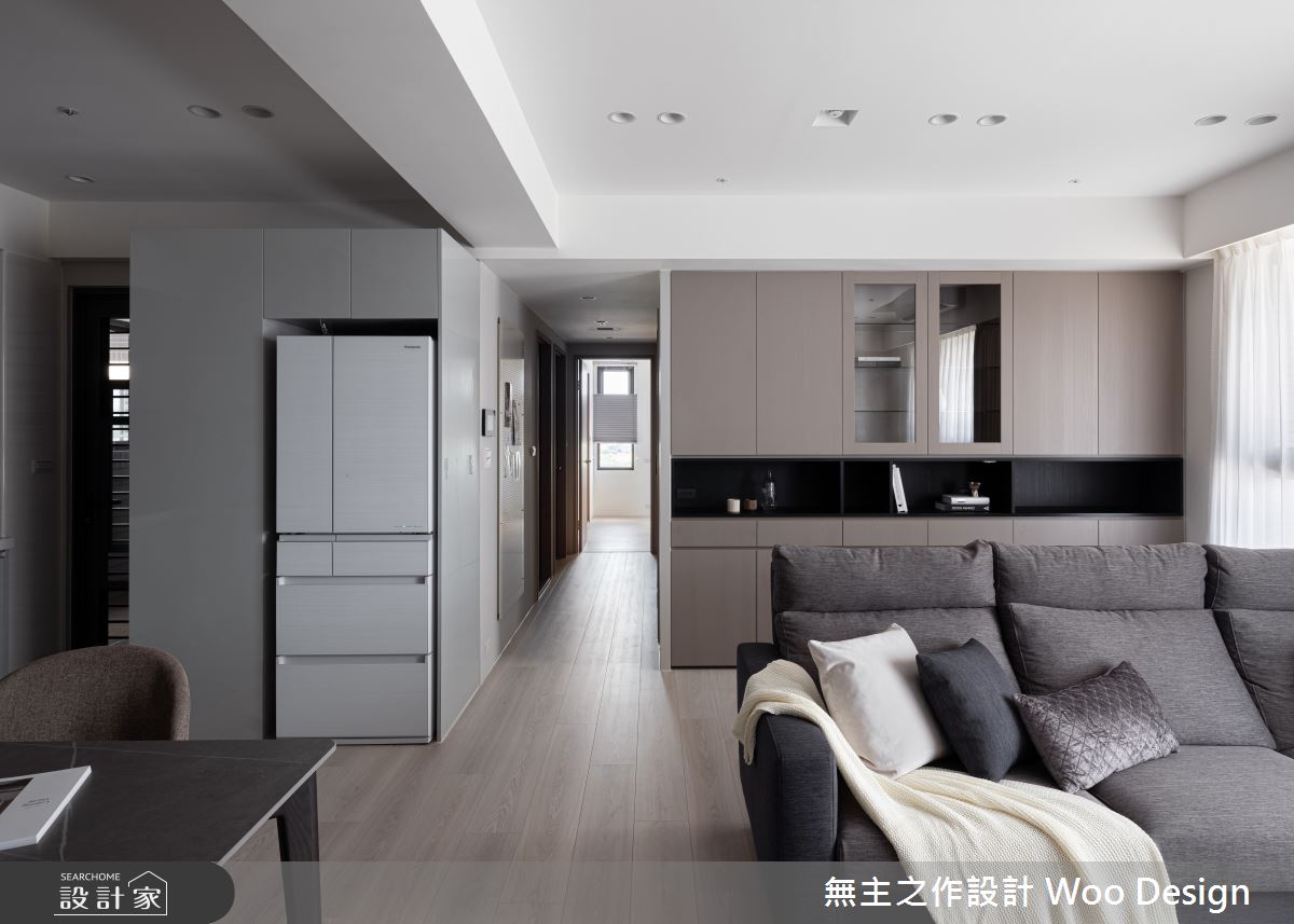 無主之作空間設計以乳膠漆、超耐磨木地板、烤漆、系統板材、賽麗石、噴漆的搭配應用,呈現簡約風居家氛圍,將此間29坪、三房、單層、新成屋(5年以下)打造成舒適愜意的家庭空間,完成2位大人全家人的夢想之居。