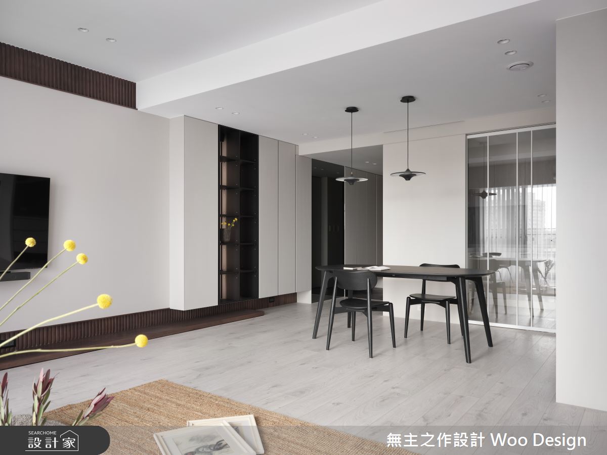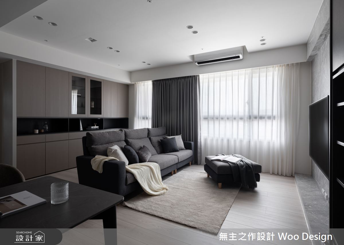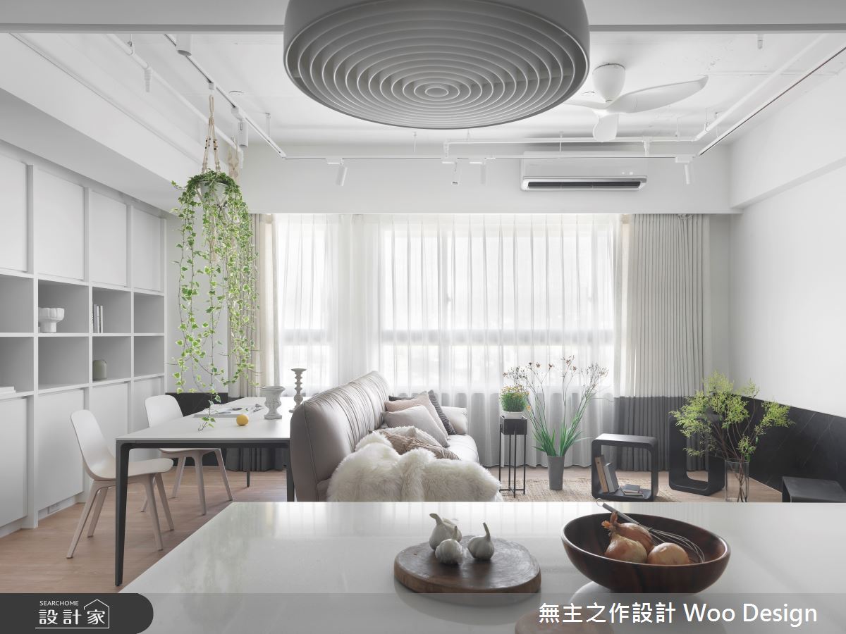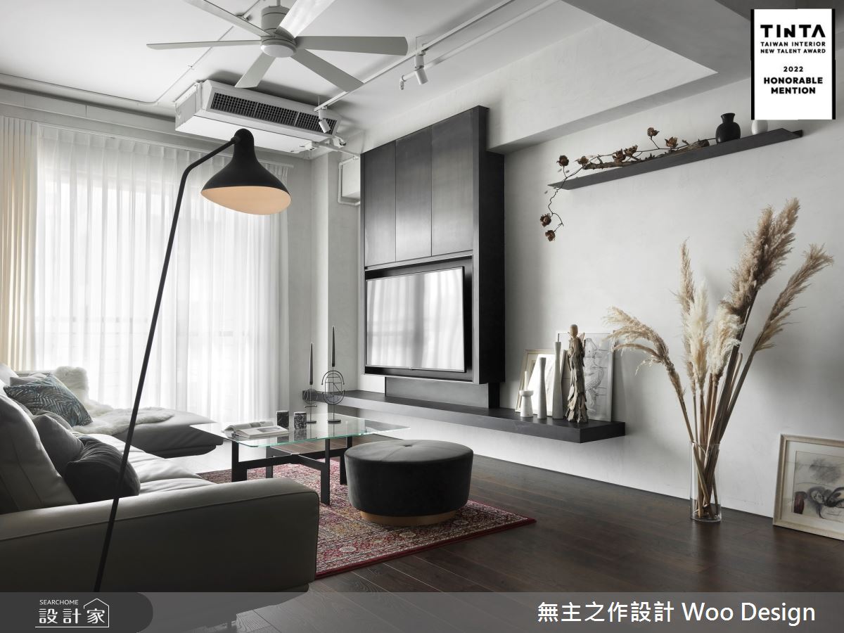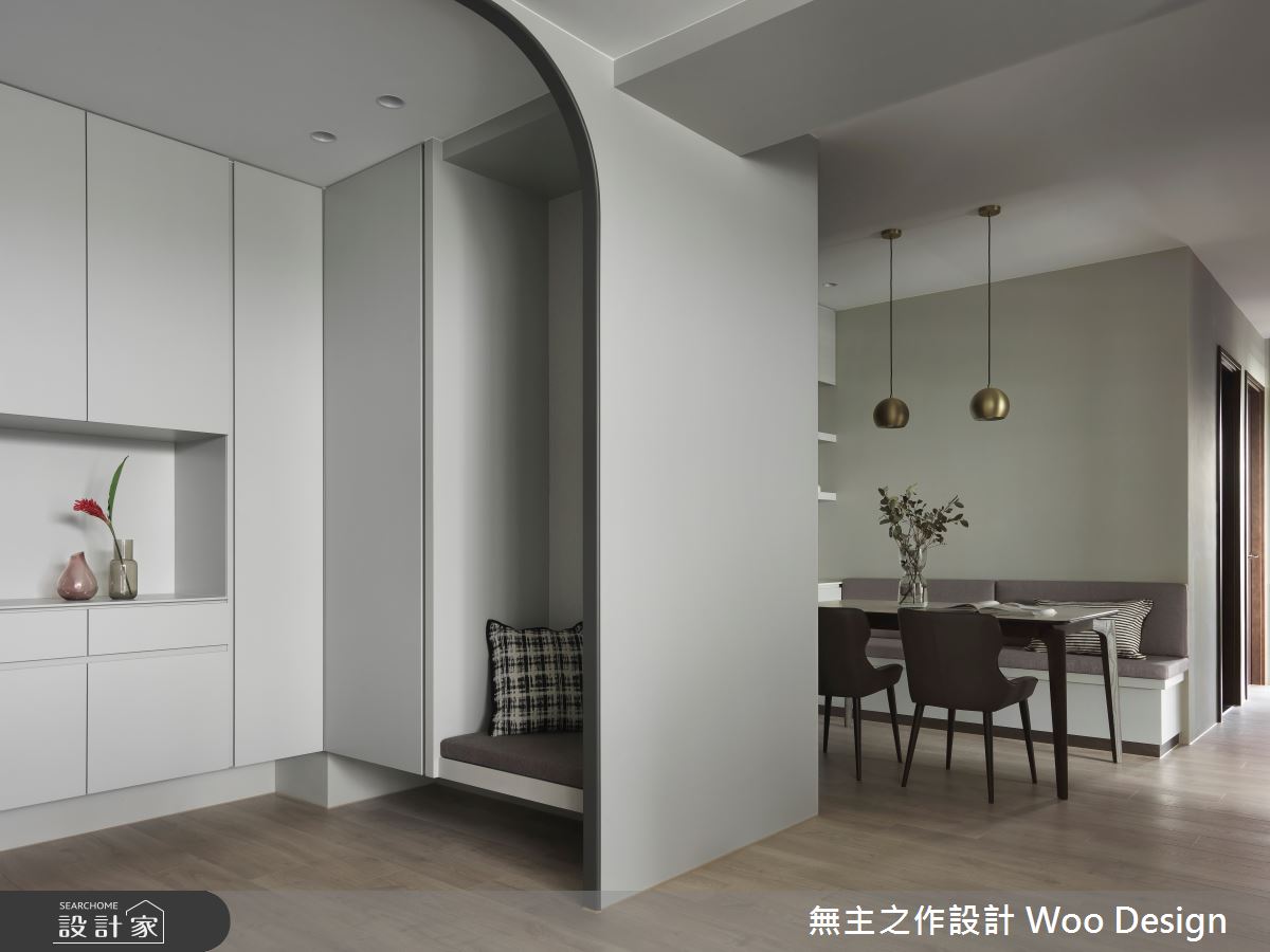 無主之作空間設計以乳膠漆、超耐磨木地板、烤漆、系統板材、賽麗石、噴漆的搭配應用,呈現簡約風居家氛圍,將此間29坪、三房、單層、新成屋(5年以下)打造成舒適愜意的家庭空間,完成2位大人全家人的夢想之居。