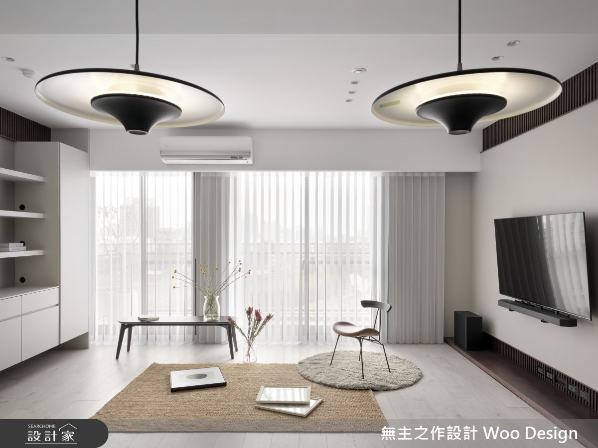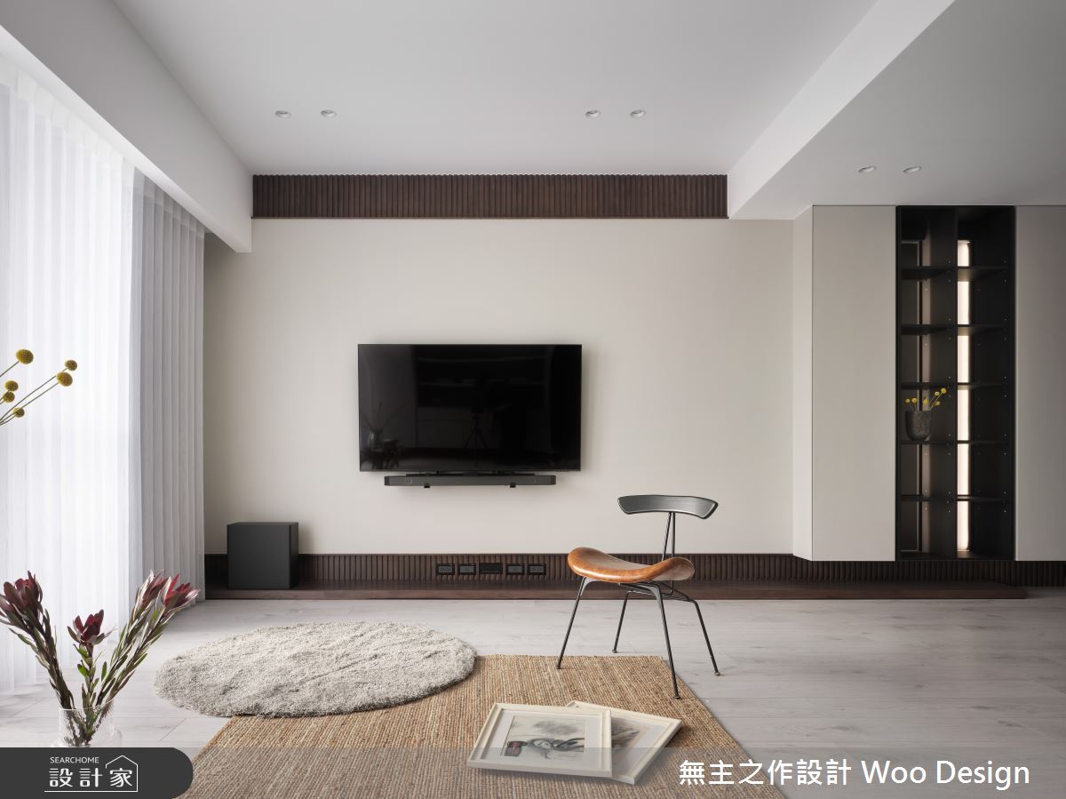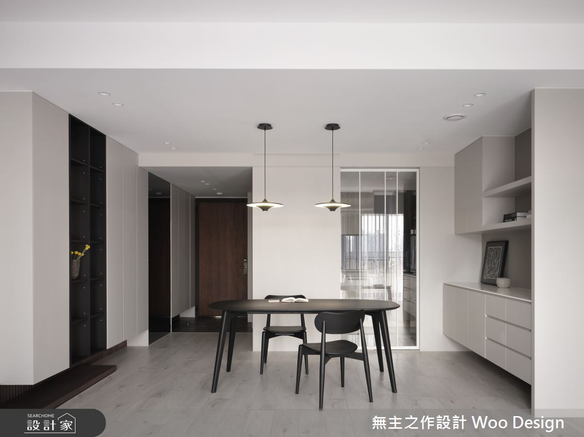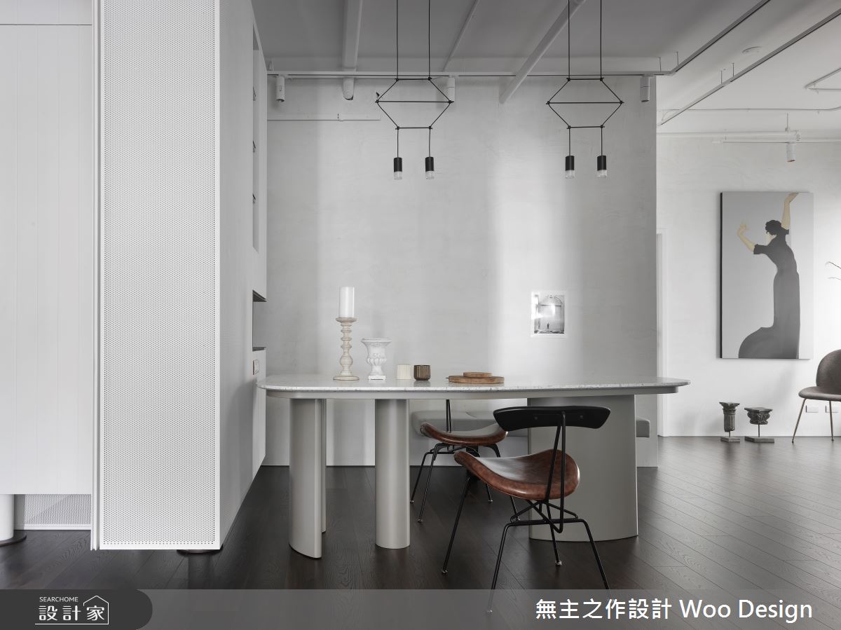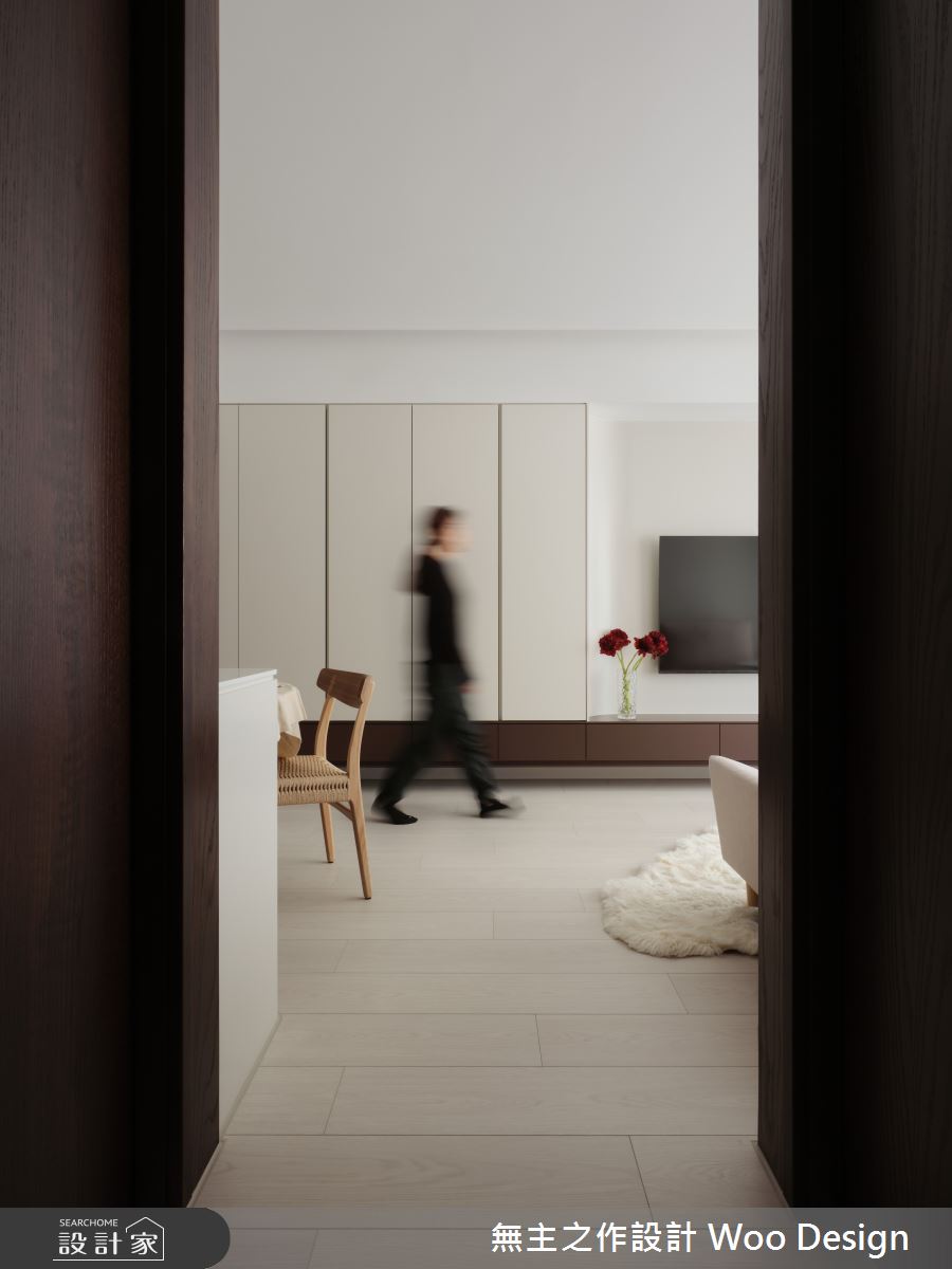 無主之作空間設計以乳膠漆、超耐磨木地板、烤漆、系統板材、賽麗石、噴漆的搭配應用,呈現簡約風居家氛圍,將此間29坪、三房、單層、新成屋(5年以下)打造成舒適愜意的家庭空間,完成2位大人全家人的夢想之居。