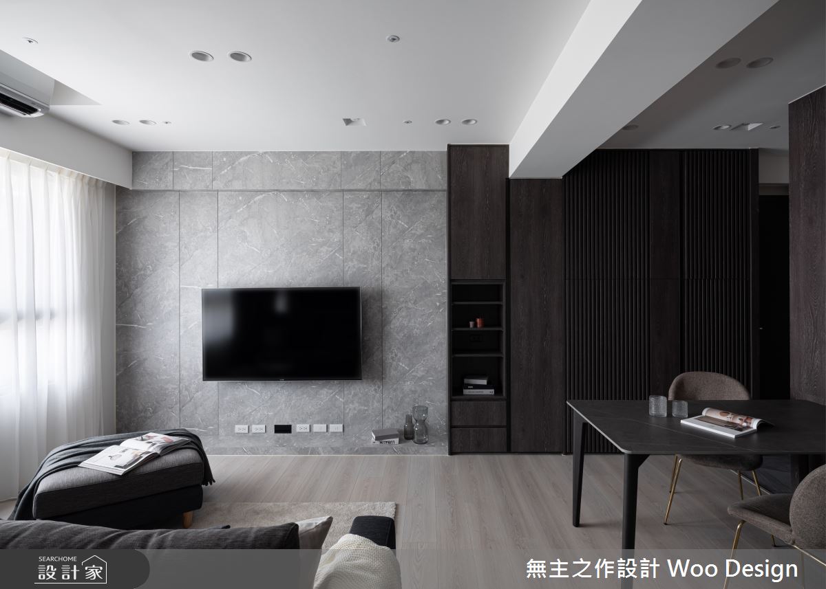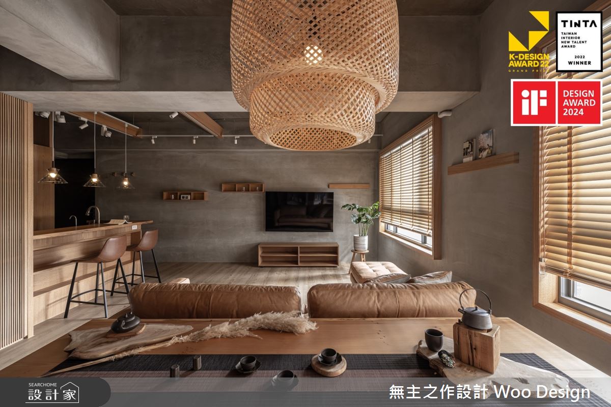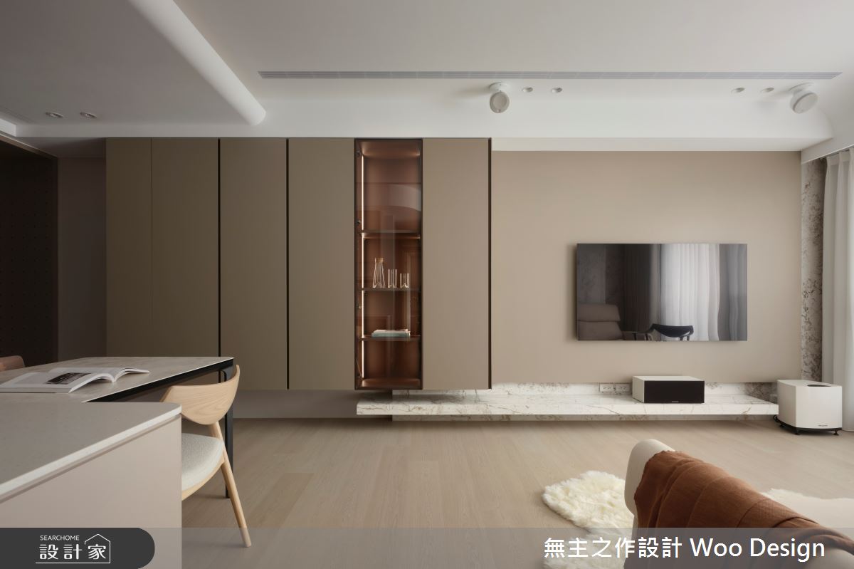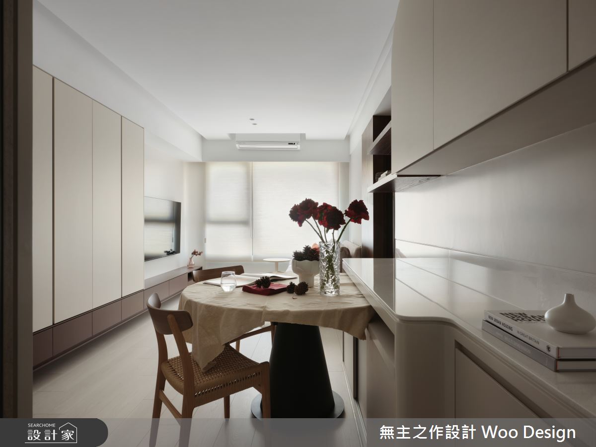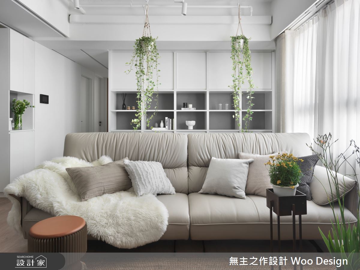 無主之作空間設計以乳膠漆、超耐磨木地板、烤漆、系統板材、賽麗石、噴漆的搭配應用,呈現簡約風居家氛圍,將此間29坪、三房、單層、新成屋(5年以下)打造成舒適愜意的家庭空間,完成2位大人全家人的夢想之居。
