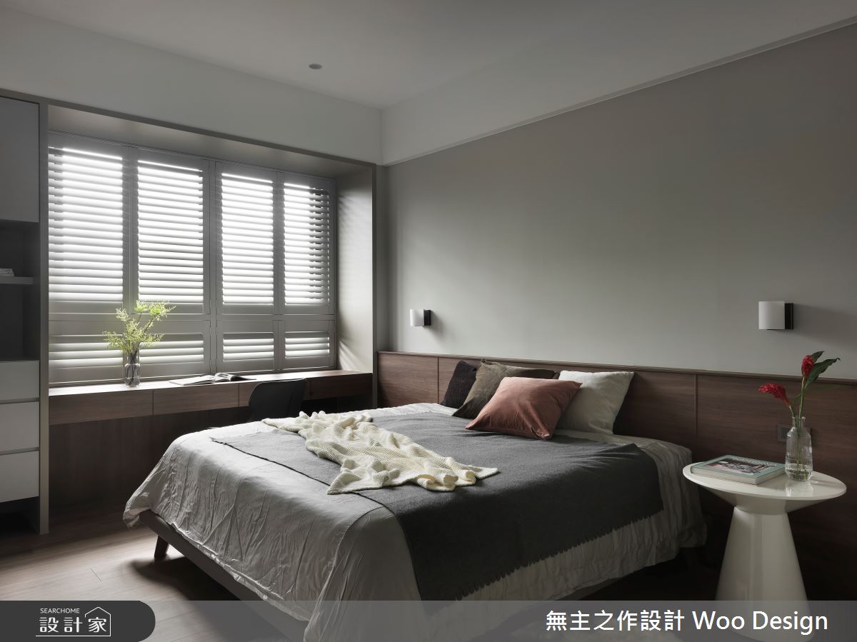 無主之作空間設計以乳膠漆、超耐磨木地板、木作貼皮、烤漆、鋼刷木皮、系統板材、木百葉、噴漆的搭配應用,呈現現代美式風居家氛圍,將此間34坪、四房、單層、新成屋(5年以下)打造成舒適愜意的家庭空間,完成1位大人全家人的夢想之居。