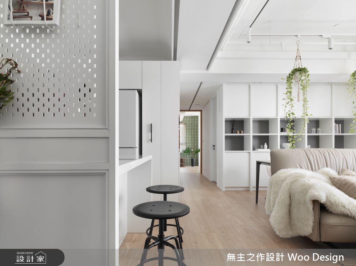 由無主之作空間設計精心規劃的18坪兩房住宅空間,家庭成員一共有2位大人、2位小孩。因應屋主需求,設計師運用北歐風作為主軸,搭配乳膠漆、超耐磨木地板、木作貼皮、烤漆、鋼刷木皮、系統板材、人造石、噴漆,打造全家人的夢想家居。