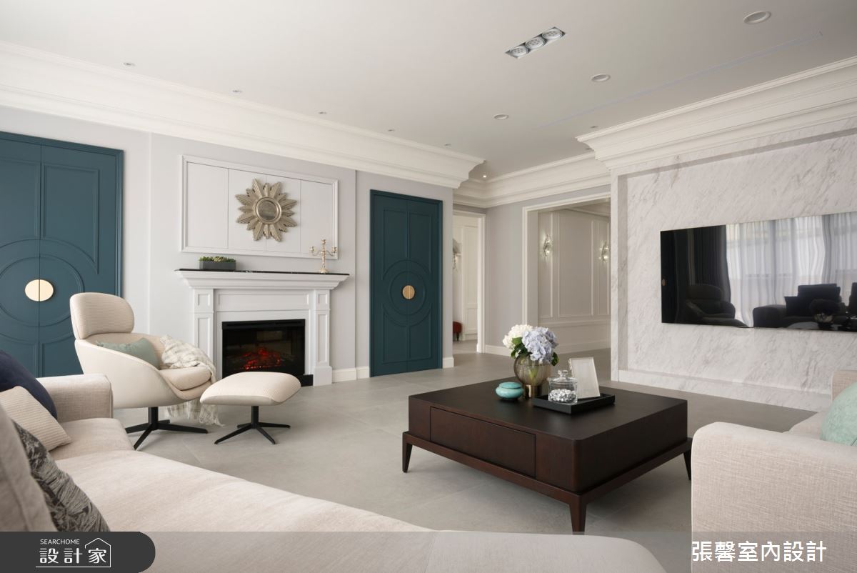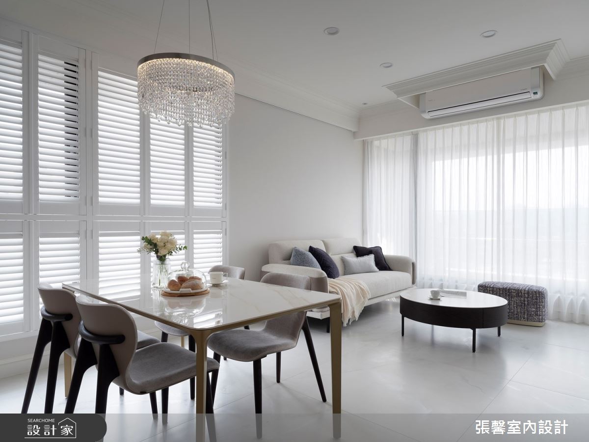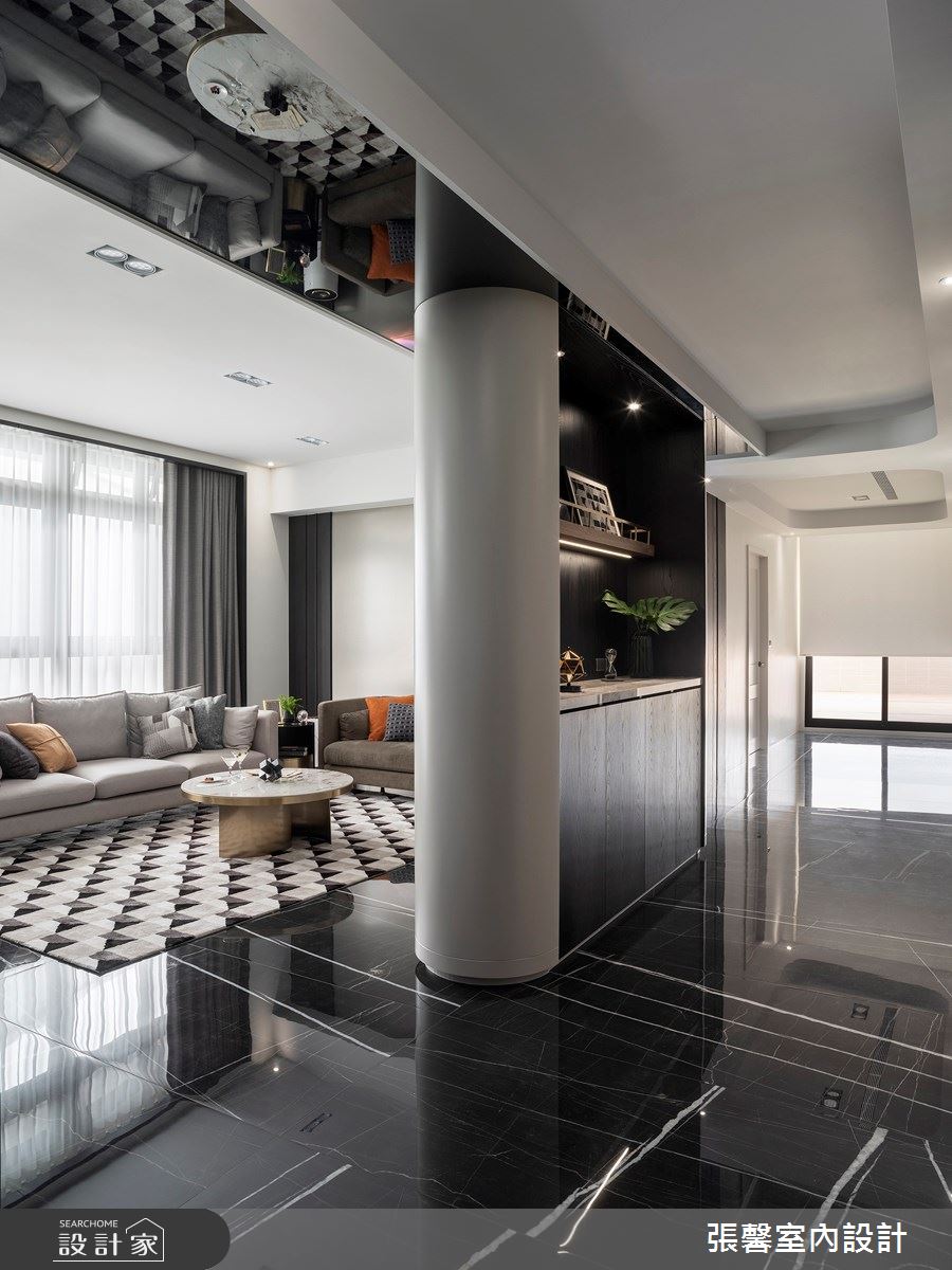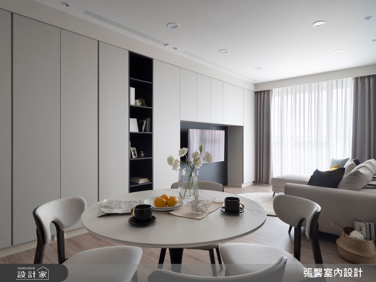 張馨室內設計以油漆、乳膠漆、花磚、木地板、鐵件、烤玻、鍍鈦金屬、木作貼皮、系統板材、磁磚、木百葉、人造石、石材、線板、噴漆的搭配應用,呈現現代風居家氛圍,將此間31坪、兩房、單層、新成屋(5年以下)打造成舒適愜意的家庭空間,完成2位大人、1位小孩全家人的夢想之居。