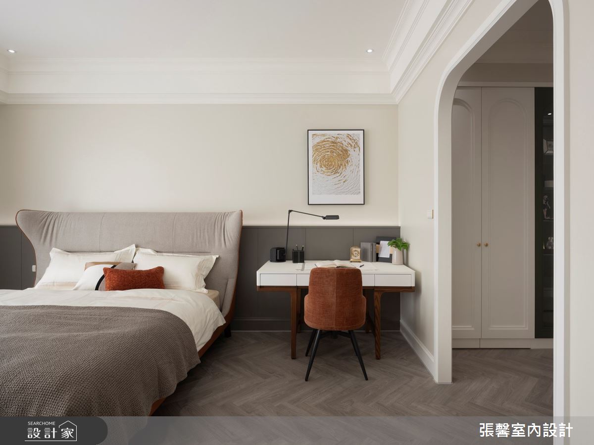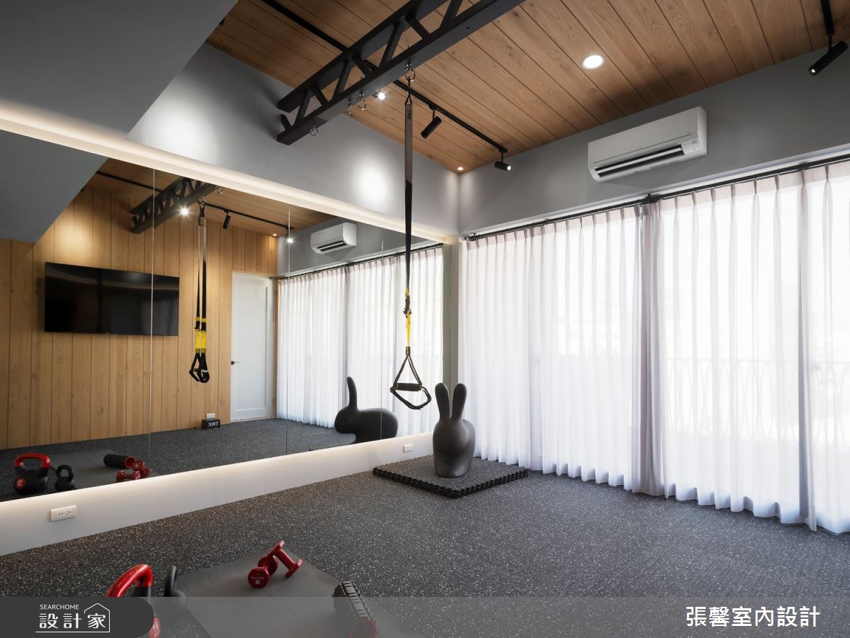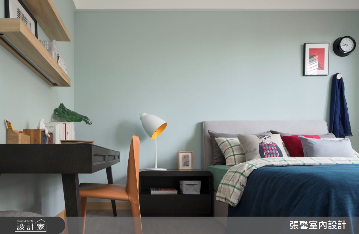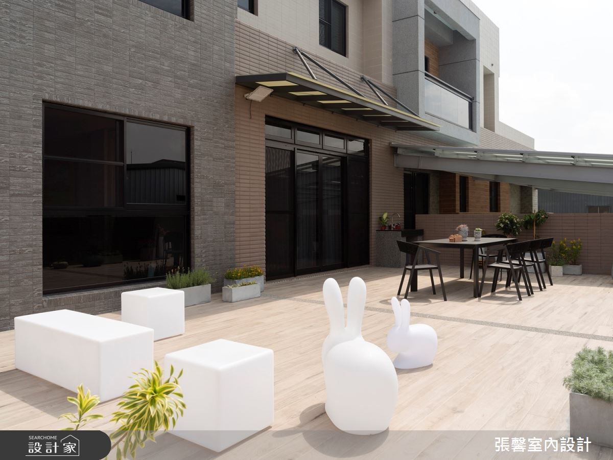 張馨室內設計以油漆、乳膠漆、花磚、木地板、鐵件、烤玻、鍍鈦金屬、木作貼皮、系統板材、磁磚、木百葉、人造石、石材、線板、噴漆的搭配應用,呈現現代風居家氛圍,將此間31坪、兩房、單層、新成屋(5年以下)打造成舒適愜意的家庭空間,完成2位大人、1位小孩全家人的夢想之居。