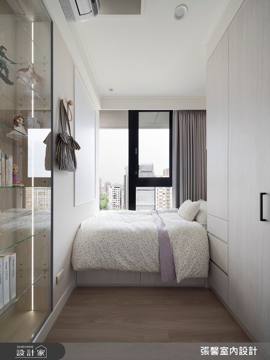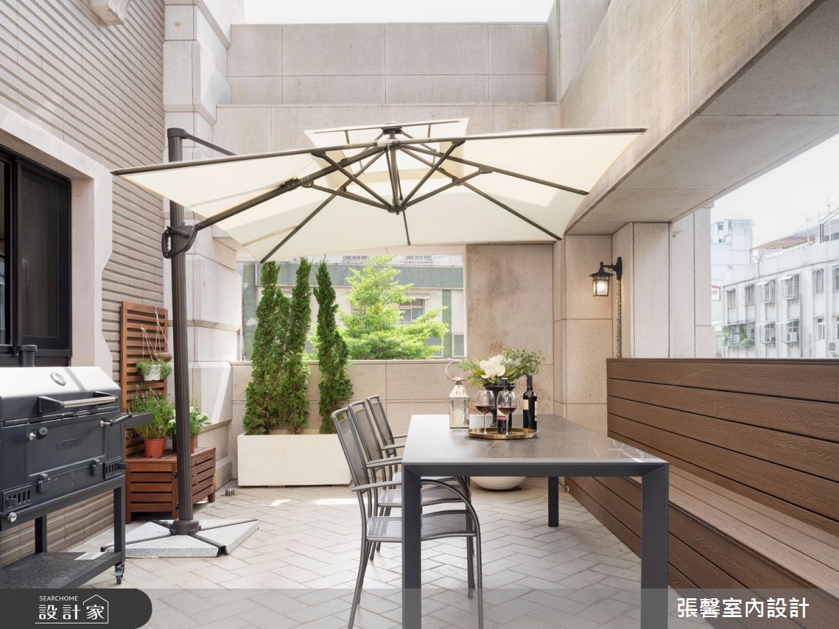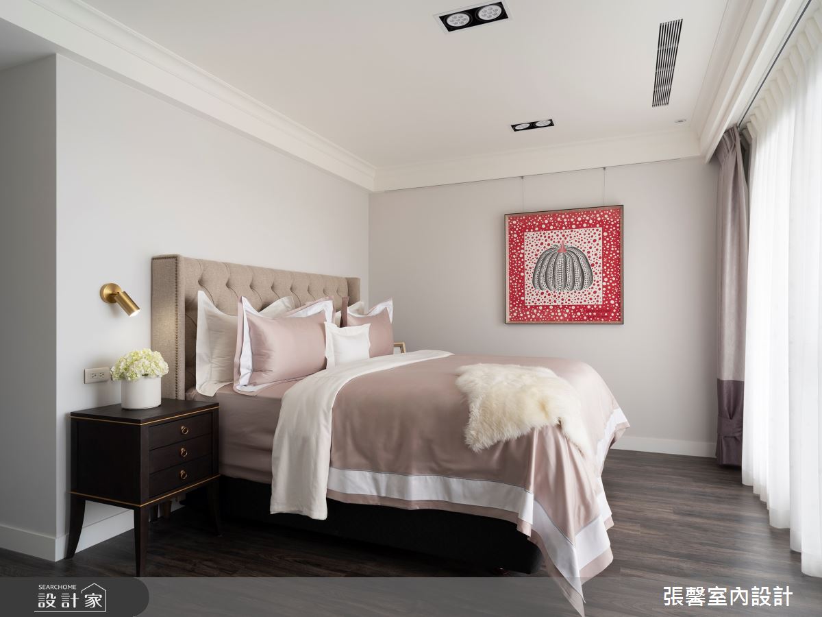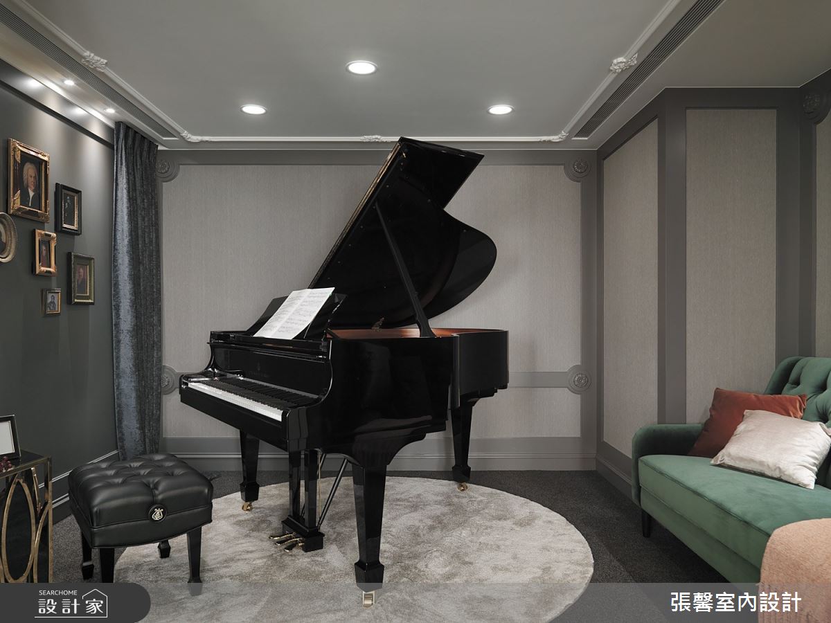 張馨室內設計以油漆、乳膠漆、花磚、木地板、鐵件、烤玻、鍍鈦金屬、木作貼皮、系統板材、磁磚、木百葉、人造石、石材、線板、噴漆的搭配應用,呈現現代風居家氛圍,將此間31坪、兩房、單層、新成屋(5年以下)打造成舒適愜意的家庭空間,完成2位大人、1位小孩全家人的夢想之居。
