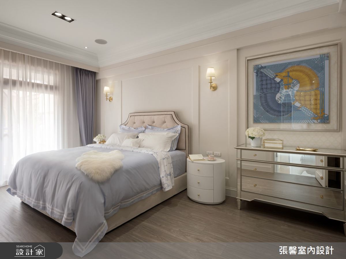 張馨室內設計以油漆、乳膠漆、花磚、壁紙、木地板、鐵件、鍍鈦金屬、木作貼皮、系統板材、大理石、磁磚、木百葉、人造石、線板、噴漆的搭配應用,呈現美式風居家氛圍,將此間94.5坪、六房、透天別墅、新成屋(5年以下)打造成舒適愜意的家庭空間,完成2位大人、4位小孩全家人的夢想之居。