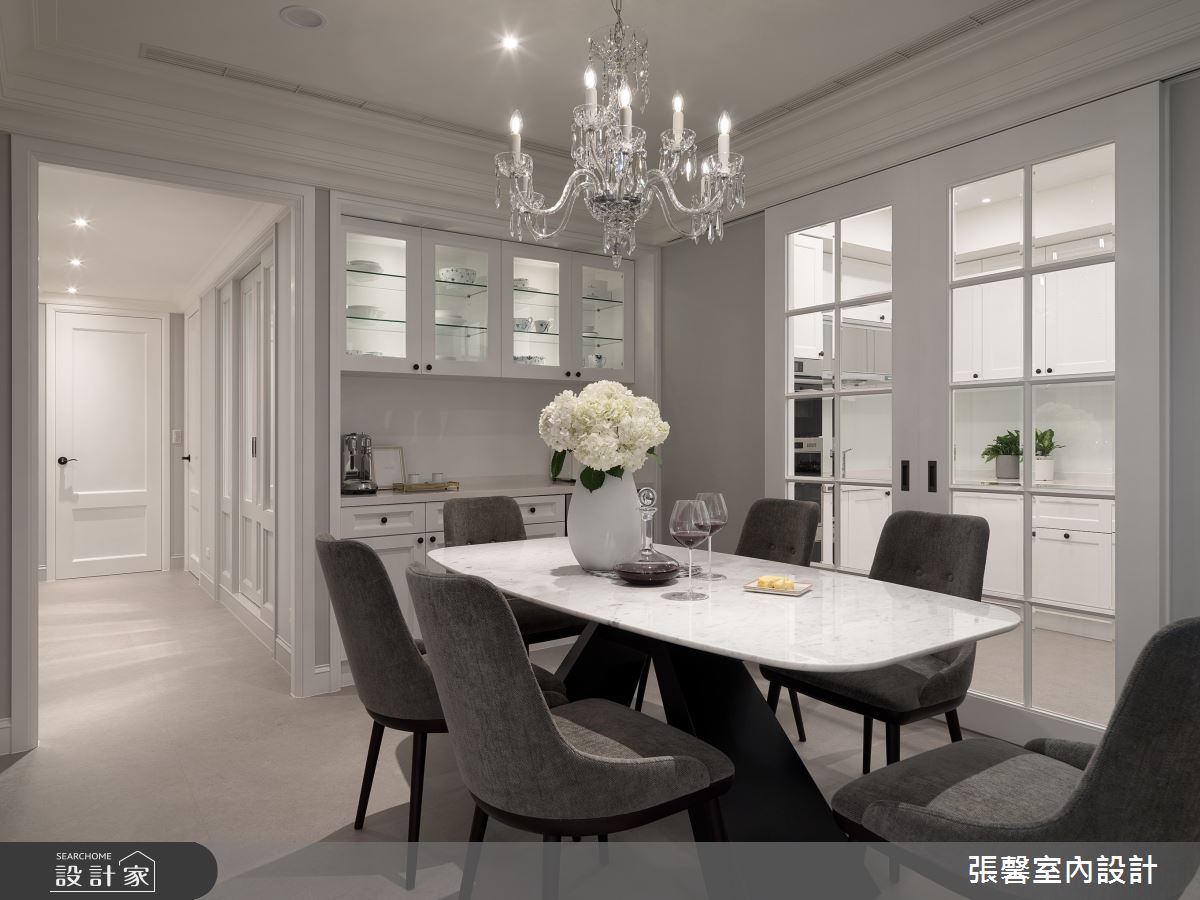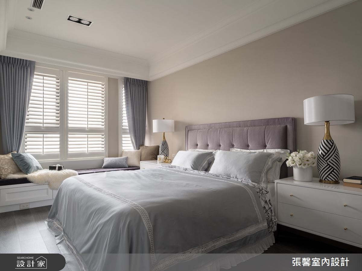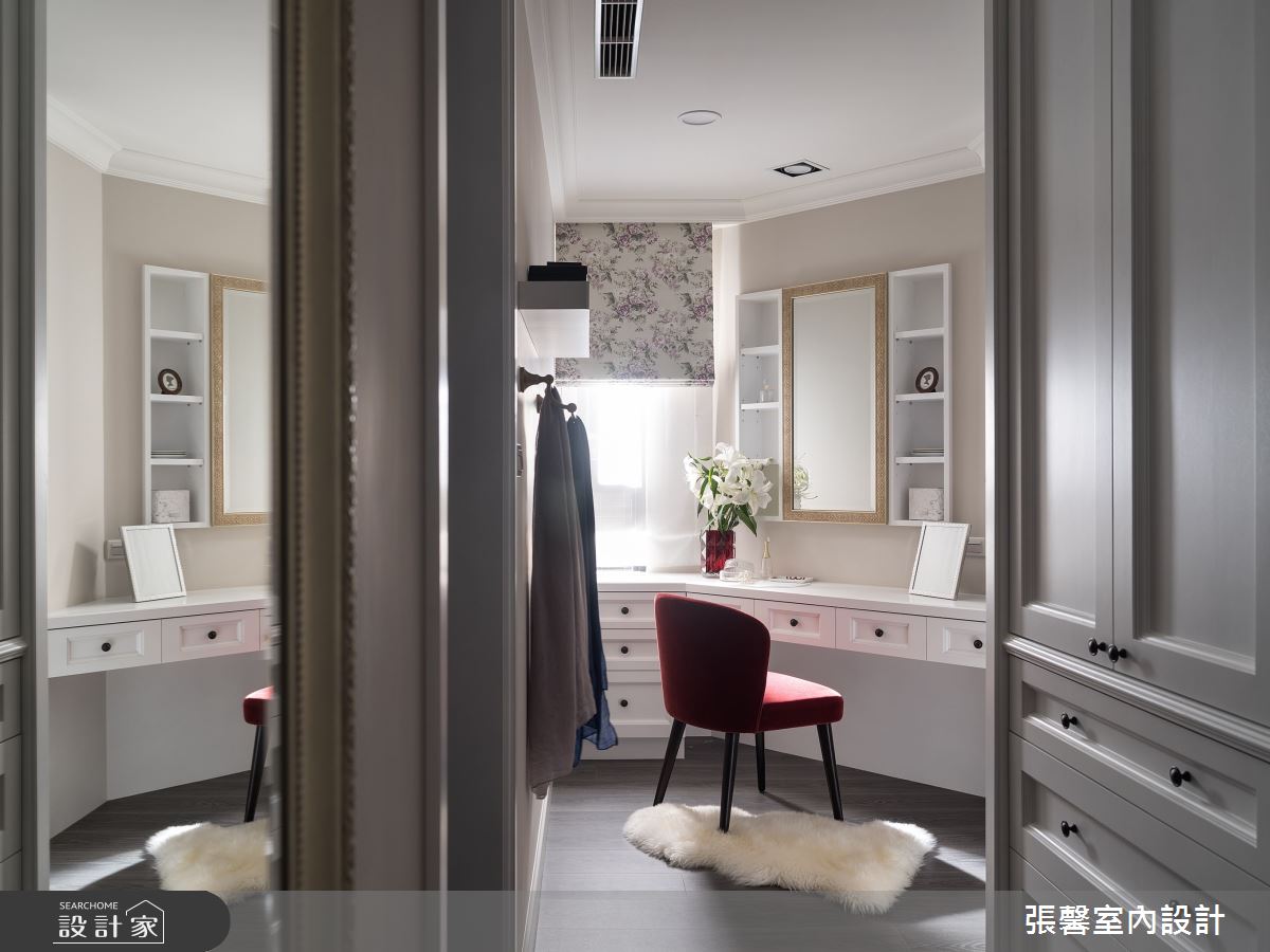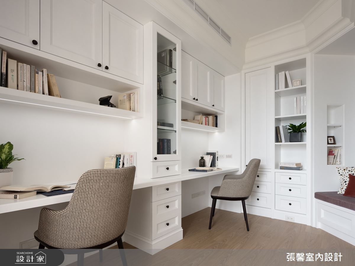 由張馨室內設計精心規劃的35坪一房住宅空間,家庭成員一共有2位大人。因應屋主需求,設計師運用美式風作為主軸,搭配油漆、乳膠漆、壁紙、超耐磨木地板、不鏽鋼、鐵件、鍍鈦金屬、木作貼皮、系統板材、大理石、磁磚、木百葉、賽麗石、繃布、線板、噴漆,打造全家人的夢想家居。