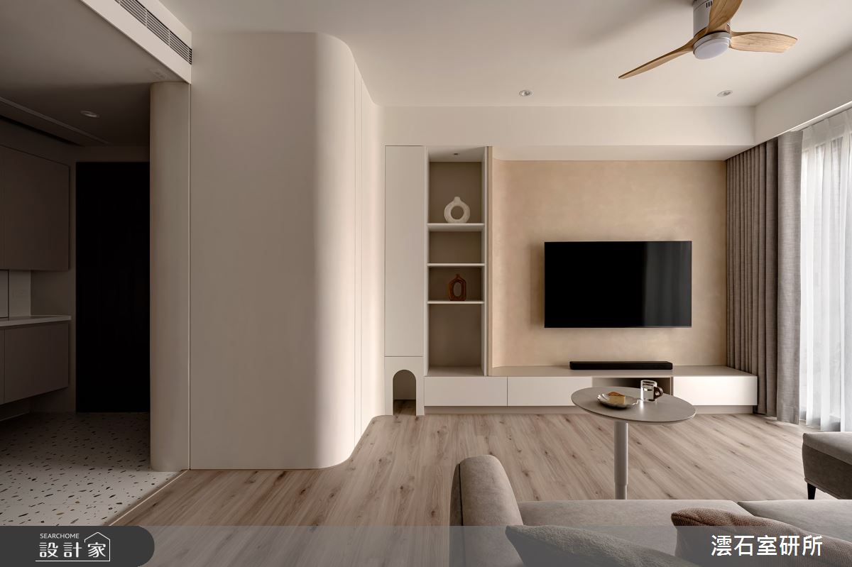 澐石室研所以油漆、花磚、超耐磨木地板、系統板材、水泥/水泥粉光的搭配應用,呈現北歐風居家氛圍,將此間21坪、三房、單層、新成屋(5年以下)打造成舒適愜意的家庭空間,完成2位大人全家人的夢想之居。
