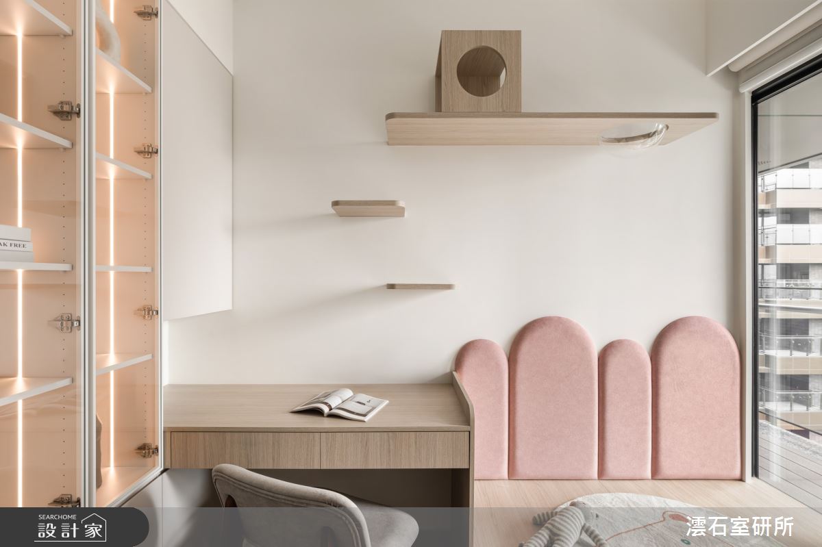 澐石室研所以油漆、乳膠漆、超耐磨木地板、鐵件、茶玻、木作貼皮、烤漆、系統板材、木百葉、繃布的搭配應用,呈現現代風居家氛圍,將此間32坪、三房、單層、新古屋(10年以下)打造成舒適愜意的家庭空間,完成2位大人、2位小孩全家人的夢想之居。