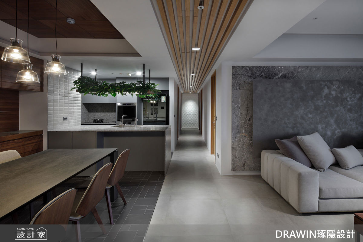 DRAWIN琢隱設計以石材、海島型木地板、長虹玻璃、鐵件、藝術漆的搭配應用,呈現奢華風居家氛圍,將此間32坪、三房、單層、新成屋(5年以下)打造成舒適愜意的家庭空間,完成全家人的夢想之居。