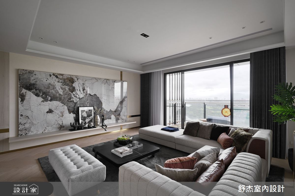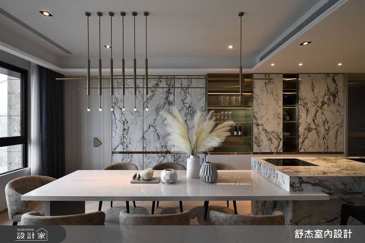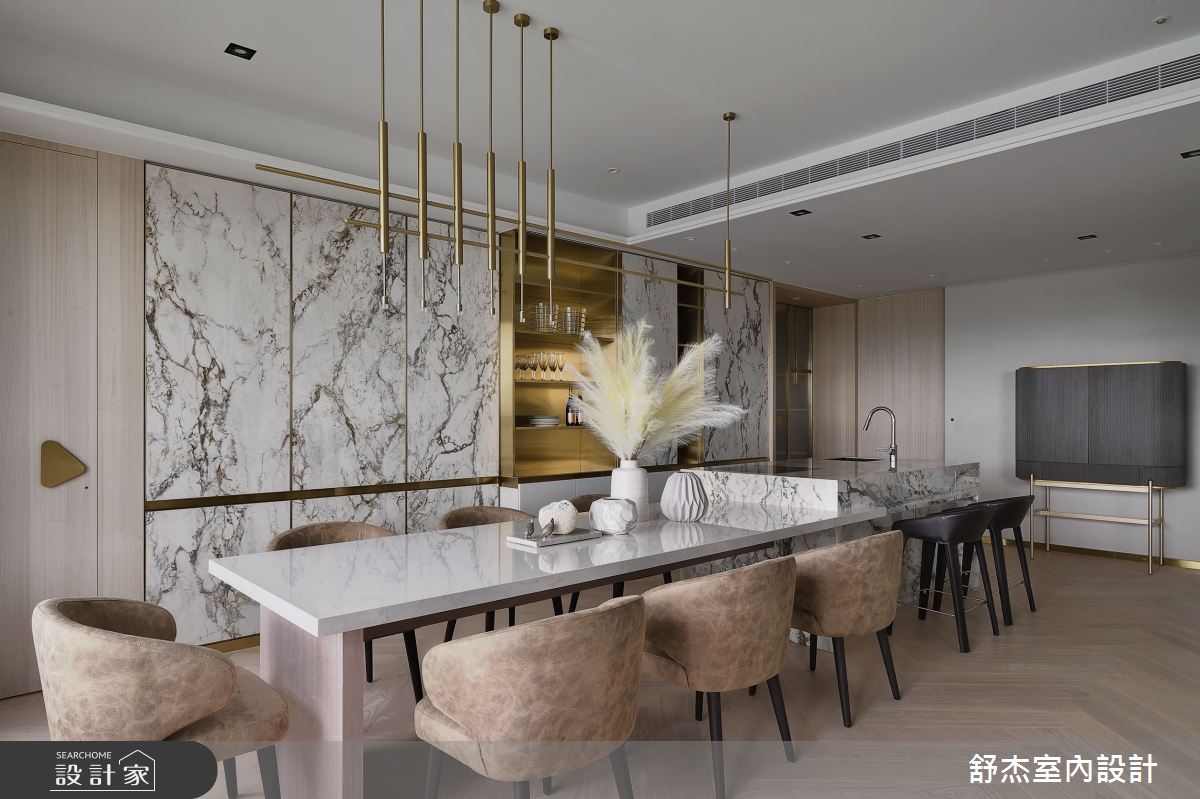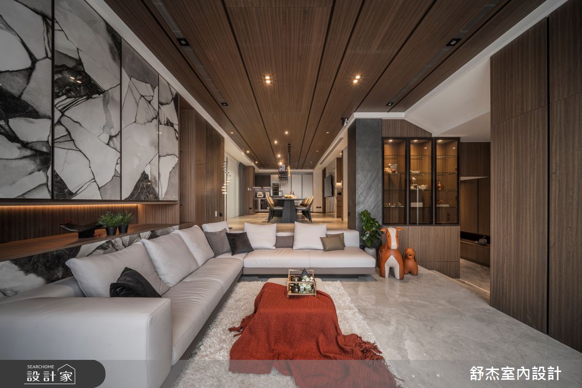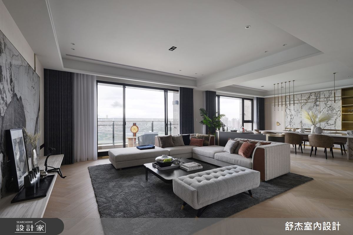 來自舒杰室內設計的142坪現代風住宅案,是一間單層新成屋(5年以下)的四房格局,設計師藉由建材以鐵件、鍍鈦金屬、大理石、皮革、石材、噴漆的搭配應用,實現一家人的理想生活。