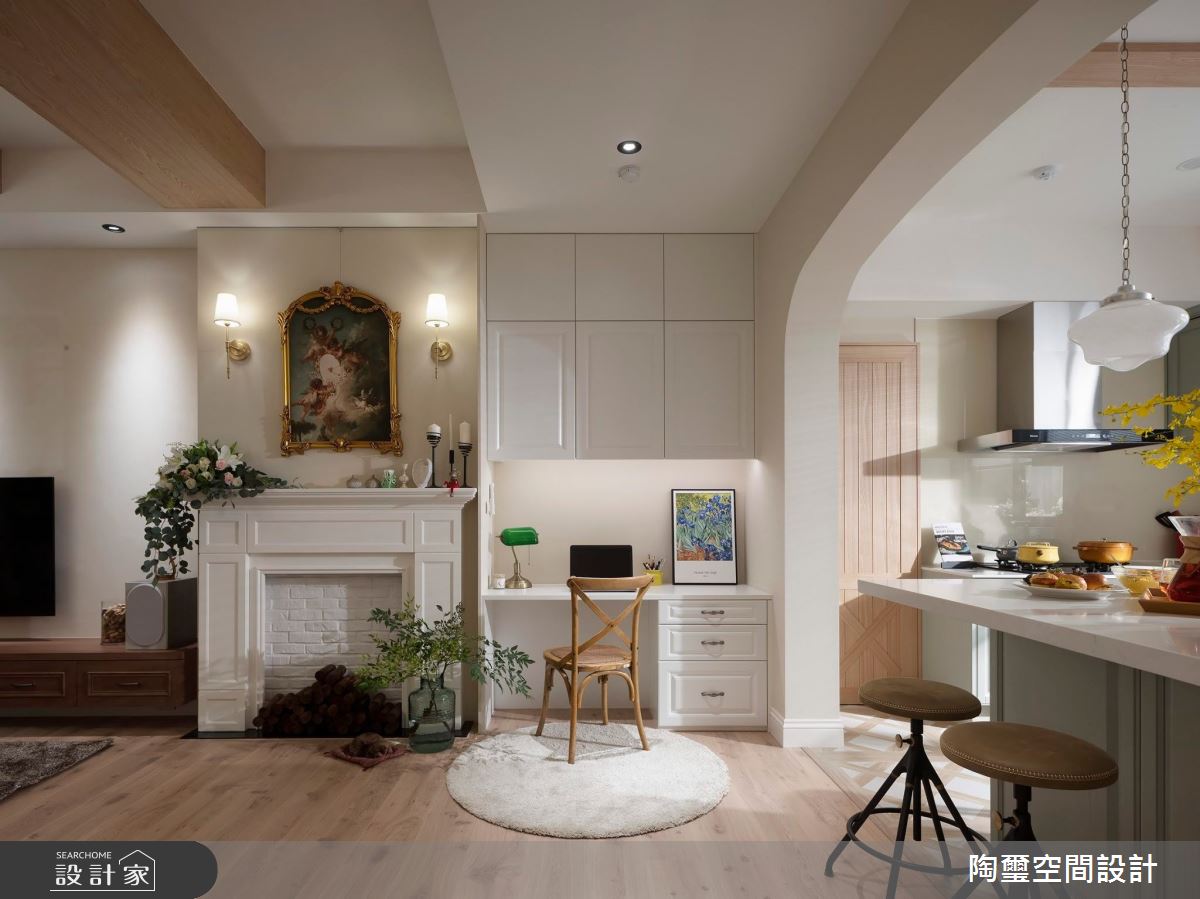 陶璽空間設計以超耐磨木地板、花磚、文化石、燈光氛圍、木條天花設計、拱門造型的搭配應用,呈現美式風居家氛圍,將此間35坪、兩房、長型屋、老屋(16~30年)打造成舒適愜意的家庭空間,完成1位大人全家人的夢想之居。