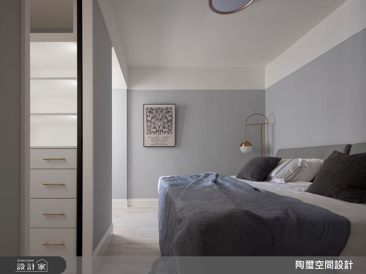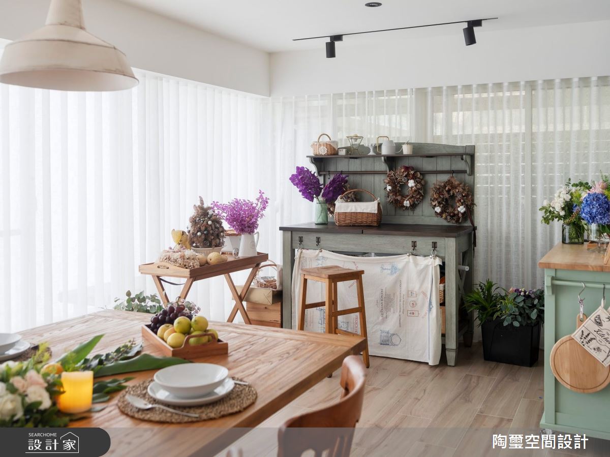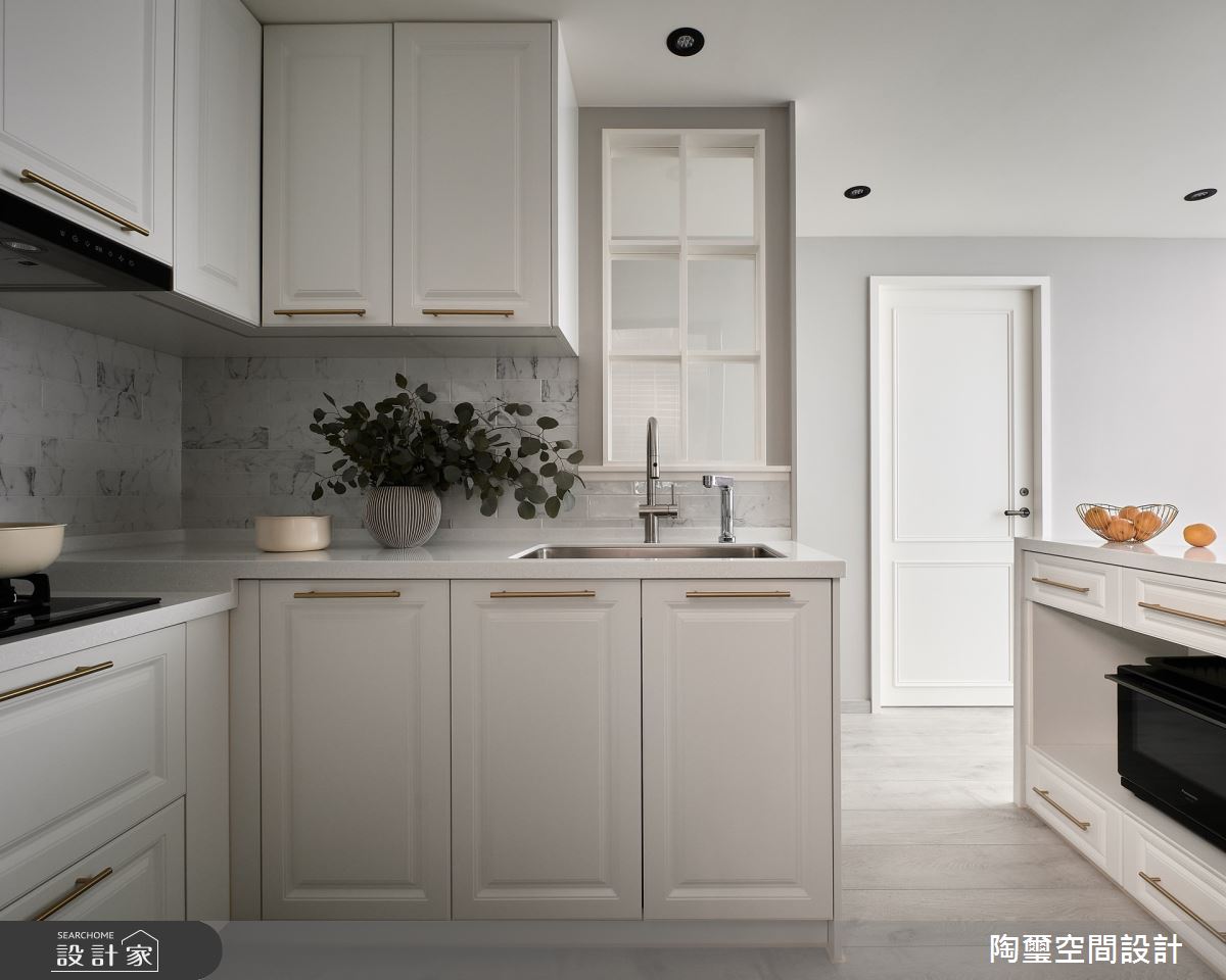陶璽空間設計以油漆、乳膠漆、鐵道磚、六角磚/蜂巢磚、花磚、木紋磚、鐵件、木作貼皮、系統板材、大理石、磁磚、木百葉、賽麗石、石材、線板、噴漆、木百葉窗、長虹玻璃的搭配應用,呈現現代美式風居家氛圍,將此間27坪、兩房、單層、老屋(31~40年)打造成舒適愜意的家庭空間,完成2位大人、1位小孩全家人的夢想之居。