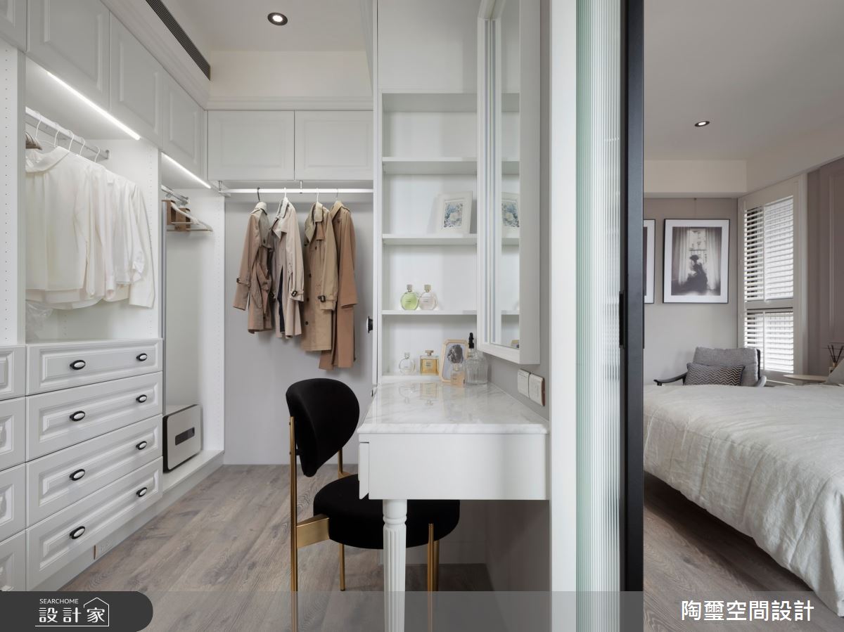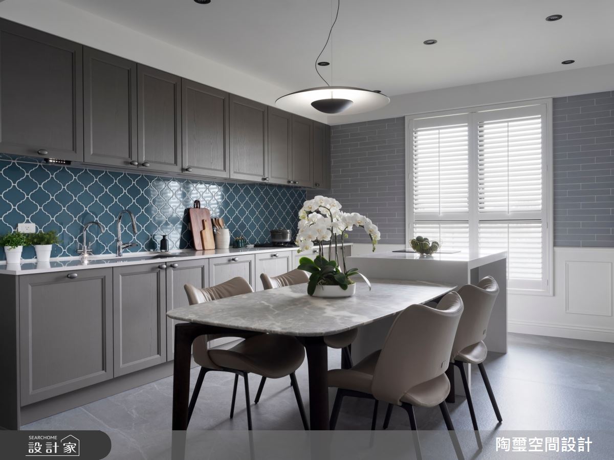 陶璽空間設計以超耐磨木地板、系統櫃、文化石、進口瓷磚、Dulux乳膠漆、花磚、木百葉窗、大理石的搭配應用,呈現英倫風居家氛圍,將此間32坪、兩房、單層、毛胚屋打造成舒適愜意的家庭空間,完成2位大人全家人的夢想之居。