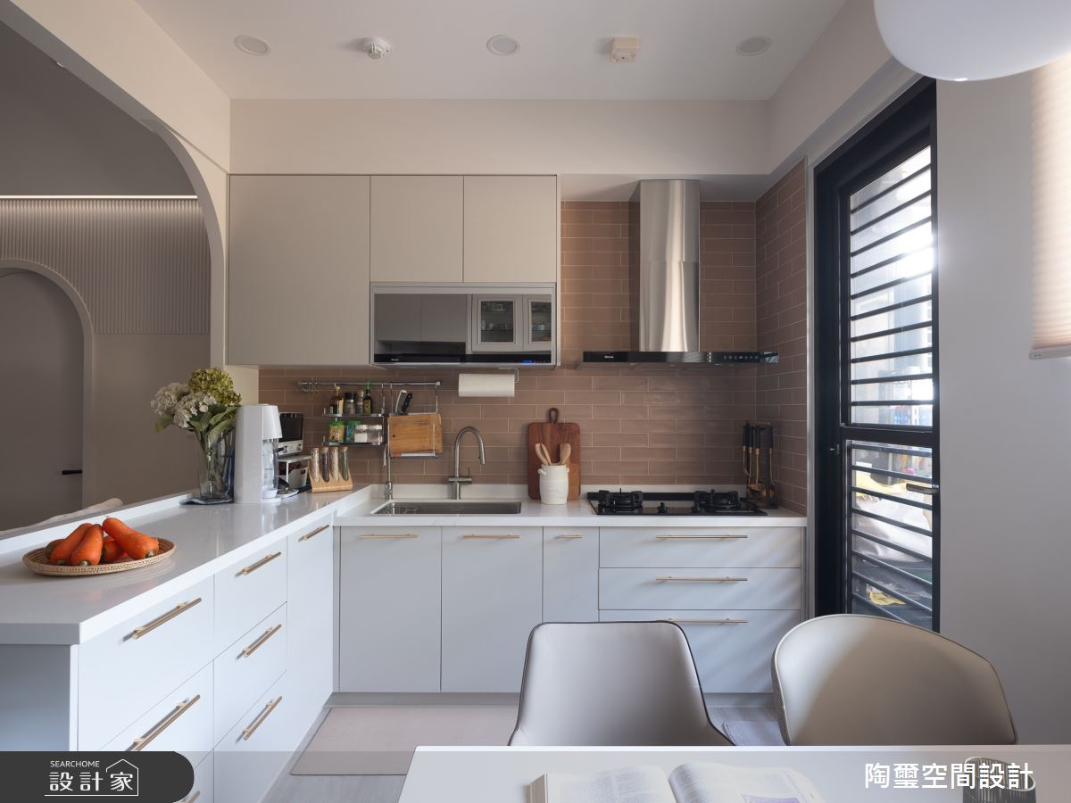 僅僅 11 坪的空間必須容納小夫妻的日常作息,該如何將原先只提供套房架構下的小坪數擴張為蘊藏烹飪、收納等完整機能的新婚宅?陶璽設計給出完美的解答! 由於坪數有限,設計師以全開放設計安排動線,劃分為 1 房 1 廳格局,入門左側為客廳與多功能餐廳,右側則為廚房與臥房。所有公領域的家具、配件皆為可移動式,大幅提升小坪數的機動性,另外更因應睡眠需求,設計師為臥房增設拉門,隨時能擁有隱私。為了打造道地鄉村風格,電視牆是帶著大理石紋理與柵欄的經典壁爐造型,而一字型廚房與收納櫃門則以簡約線板呈現。在家具軟件與建材選用上,以木百葉超耐磨木地板、木質餐桌、釘扣單椅、碎花及格紋彰顯溫柔鄉村特色。最後,全室以繽紛不扎眼的粉嫩色系,完成唯美氛圍營造,包含嬰兒藍櫃門、粉紅廚具、薄荷綠移動式中島與鵝黃色造型線板。 小編的最愛 位於多功能餐廳下方的地坪,其實還兼具頗富深度的收納機能,是相當適合小坪數的收納技巧。