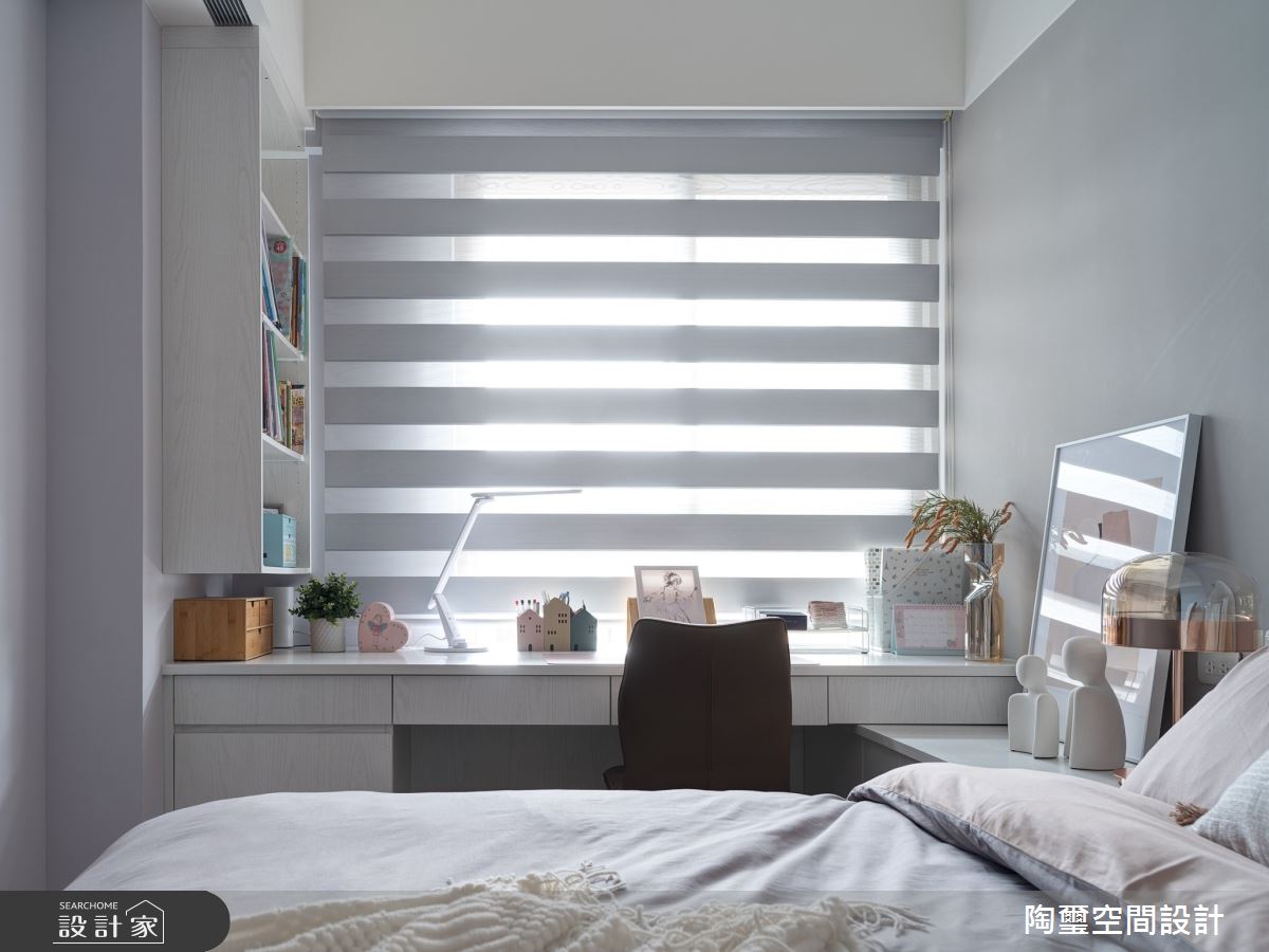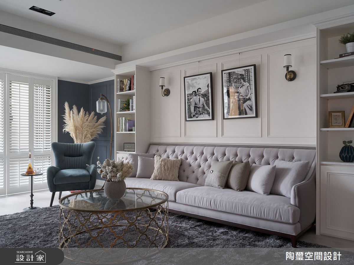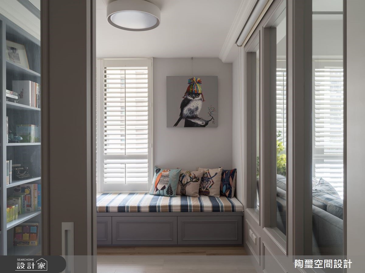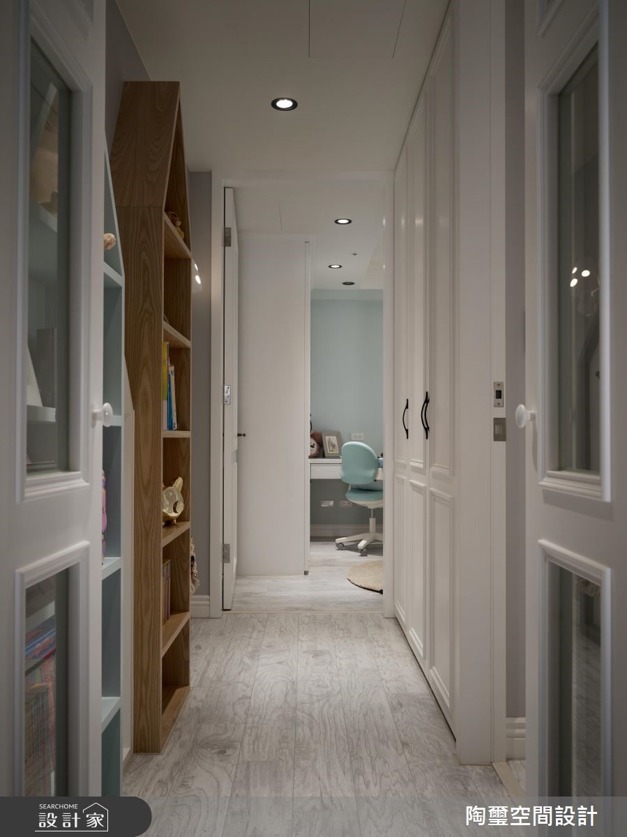 57 坪居宅,設計師減去一房、讓公共空間增加,並規劃新的玄關場域,締造更為流暢的生活動線,搭以風格營造及優雅灰藍串聯,構築出美輪美奐的美式居所,快跟著小編一起來看看吧! 循著玄關步入公共區域,可見到灰藍、純白串聯的和諧視野,並安排白色百葉窗調節自然光,讓室內顯得明亮柔和,地坪則鋪陳木地板,賦予溫暖的居家氛圍;電視主牆結合書牆功能,以質感藍調作為背景,於兩側規劃開放式格櫃,展示屋主的收藏書籍,下方亦配置封閉式的收納抽屜,美觀與實用兼具;格局上,採以開放式場域設計,讓客廳、餐廳擁有更多共享機會,增加情感交流和互動性,刻意不制式陳列的廳區家具,則營造出愜意的生活情境,讓客廳可兼顧閱讀、會客、休憩等主題;延伸至寢臥,承襲著慵懶放鬆的藍調,在床頭鋪陳具特殊紋理的壁紙、烘托空間質感,軟裝家飾則不時妝點於各角落,襯出屋主的美好品味! 小編的最愛 設計師發揮居家廊道的另一功能,於周邊配置特別的小木屋書櫃,具童趣又充滿溫暖,打造出專屬孩子的小小圖書室!