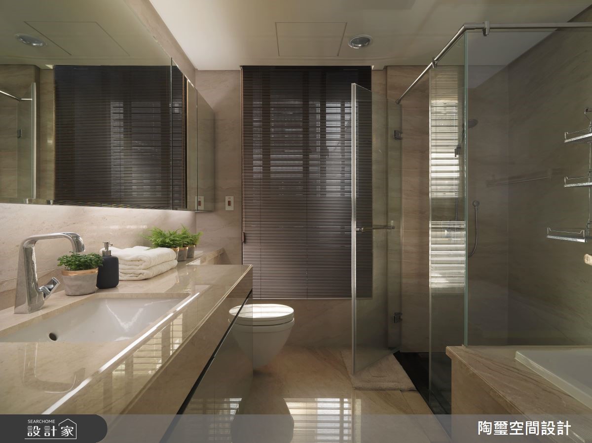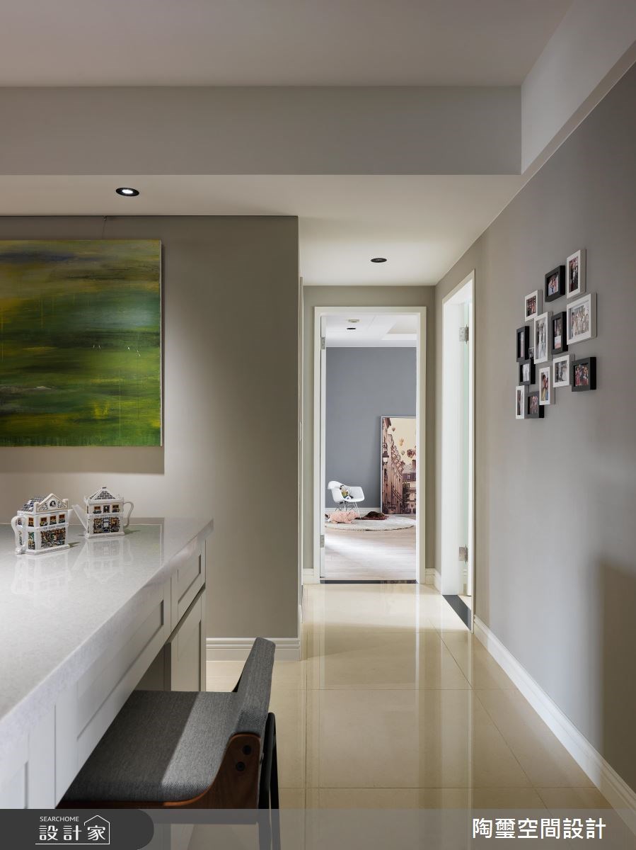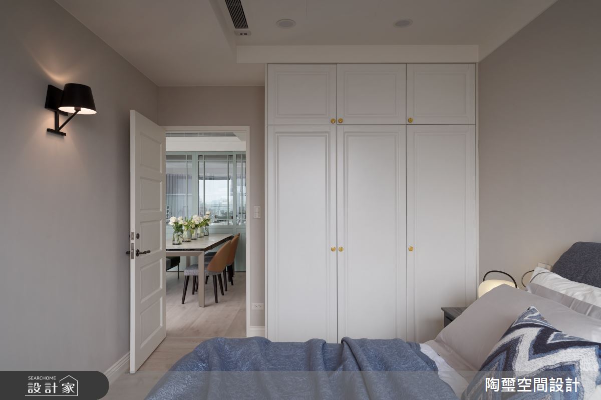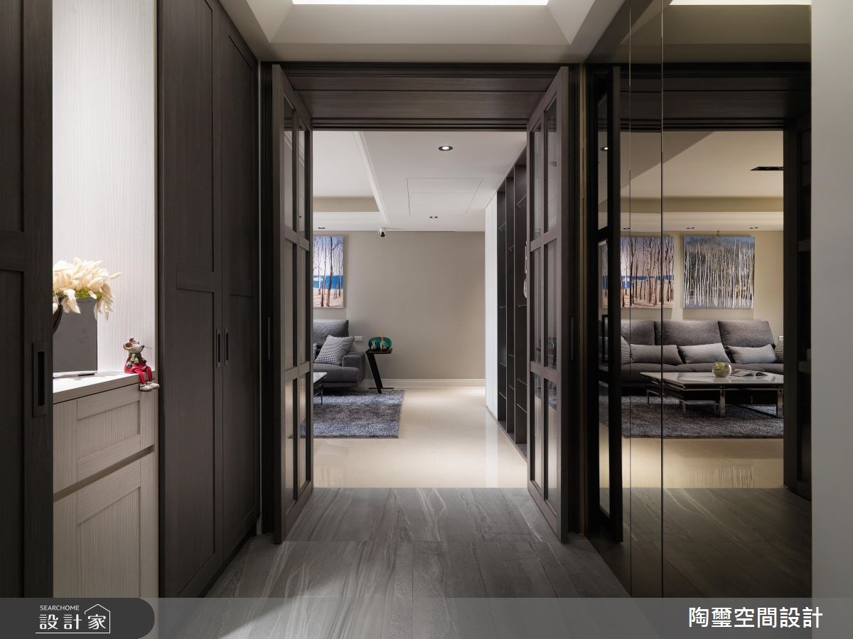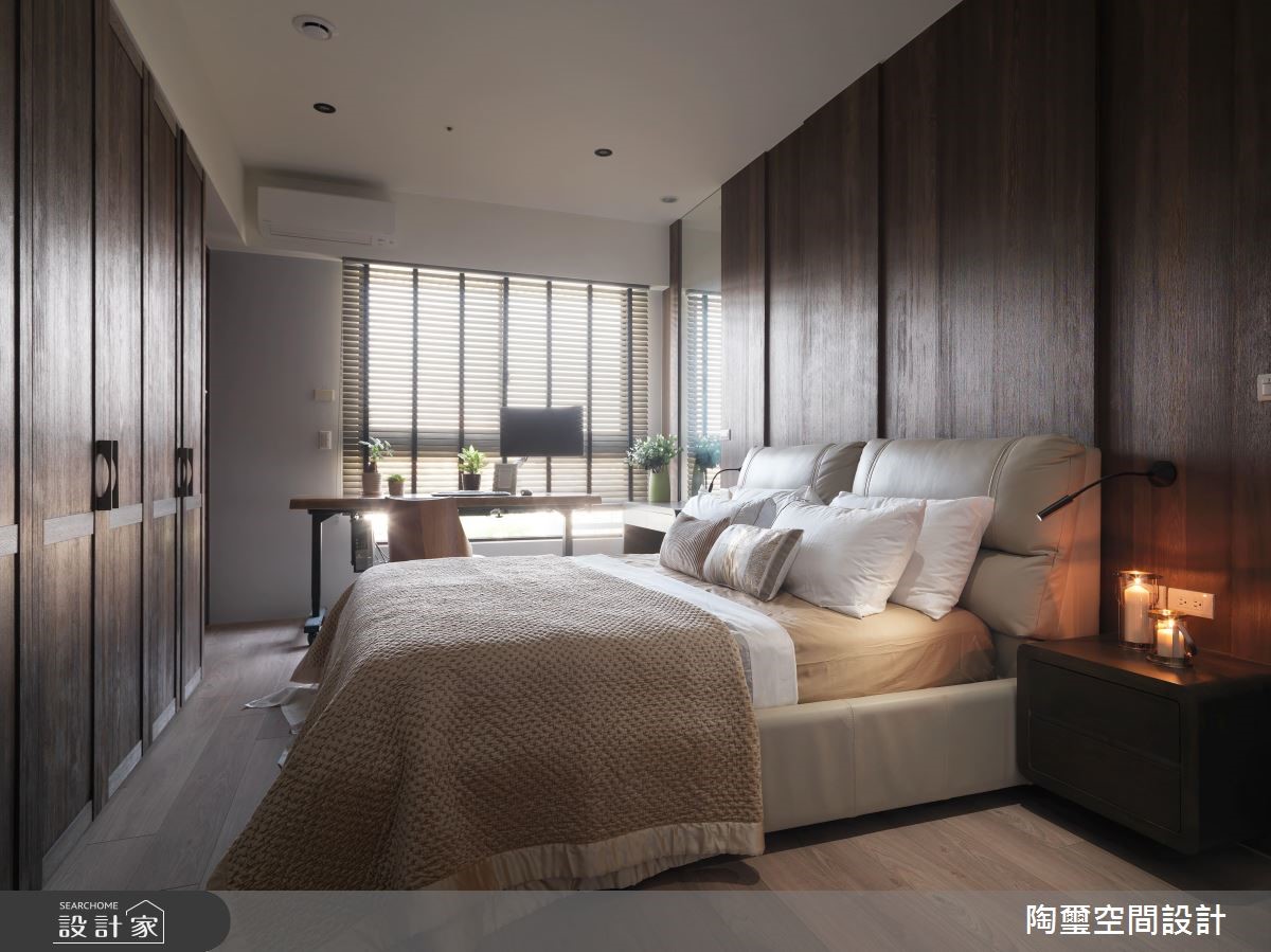 男主人在婚前已預先購置 60 坪屋案作為新婚宅,婚後透過友人口碑找到陶璽設計團隊,經由專業設計師引導,歸納出屋主喜愛的飯店風格。 居家整體風格以男主人意見為主,以沉穩色調與篤實建材營造飯店氛圍,並利用坪數優勢增加充裕收納機能。首先設計師善用建商原先的寬敞玄關,更改多功能房的開口方向,設計足夠的收納櫃體,包含廊道兩側以及茶鏡後方,並以歐式雙開門營造大宅氣勢。客廳配合屋主喜好,以紫色繃布作為電視牆設計,右側通往多功能房的門片也利用雙開門達到優雅的對襯視覺,同時也讓屋主擁有冷房效益。基於風水考量,設計師利用雙面展示櫃作為客、餐廳之間的分隔,餐廳壁面延續雙面展示櫃的大理石材質,營造低調奢華的現代風格。由於女主人的需求,設計師在用餐區域設置吧台,由於男主人平常會在吧台上閱讀,更加裝了抽屜兼具書桌機能。 小編的最愛 由於主臥格局為 L 型,設計師巧妙將前端設計為更衣間與衛浴區域,後方則是睡眠區域,並以溫暖的大地色系佐好萊塢式梳妝台,打造溫馨時尚的臥房空間。