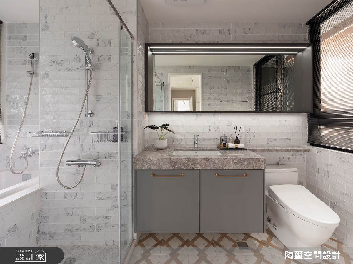 陶璽空間設計以乳膠漆、花磚、超耐磨木地板、鍍鈦金屬、系統板材、大理石、木百葉、賽麗石、線板、噴漆、義大利霧絨漆的搭配應用,呈現美式風居家氛圍,將此間29坪、四房、單層、新成屋(5年以下)打造成舒適愜意的家庭空間,完成1位大人、2位長輩全家人的夢想之居。