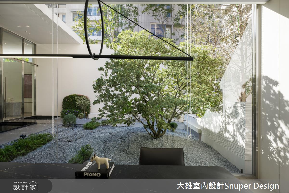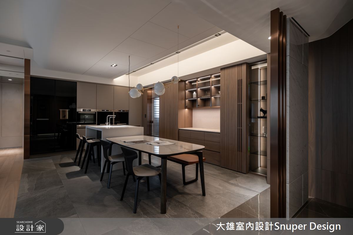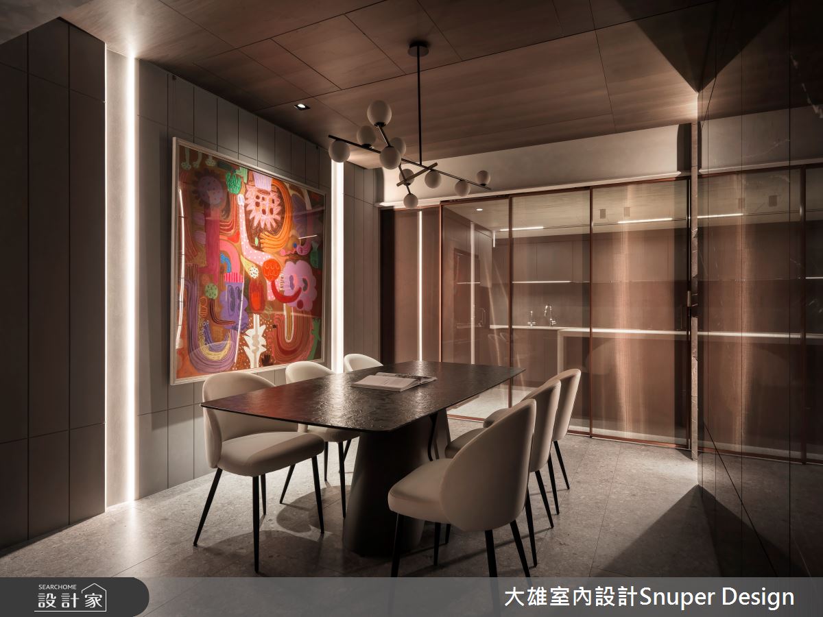大雄室內設計以油漆、特殊漆、木地板、灰鏡、長虹玻璃、木作貼皮、大理石、磁磚、木百葉、石材的搭配應用,呈現現代風居家氛圍,將此間57坪、三房、單層、新成屋(5年以下)打造成舒適愜意的家庭空間,完成2位大人、1位小孩全家人的夢想之居。