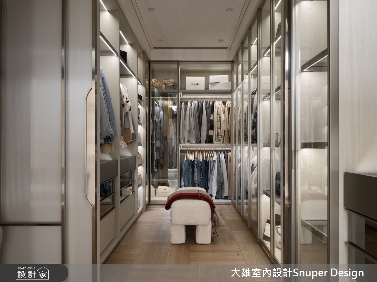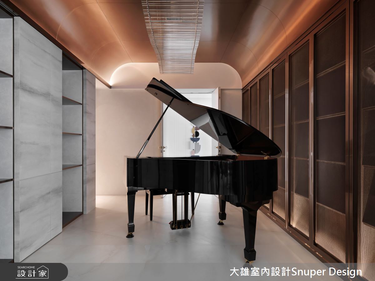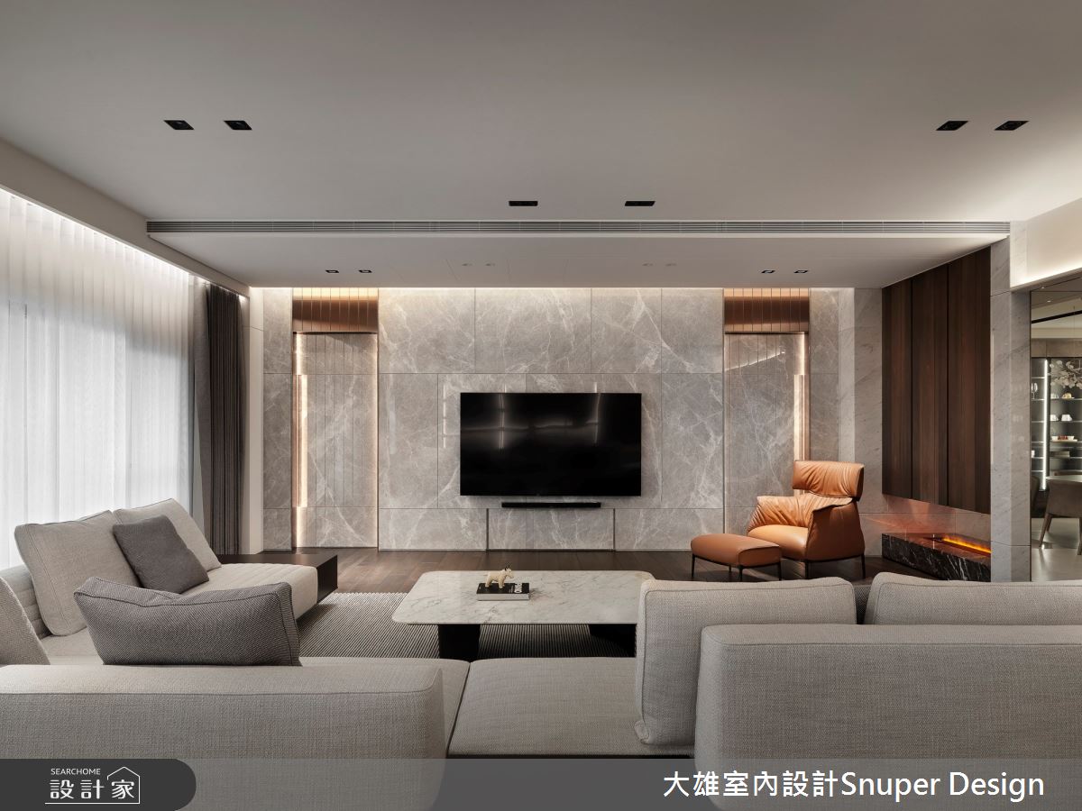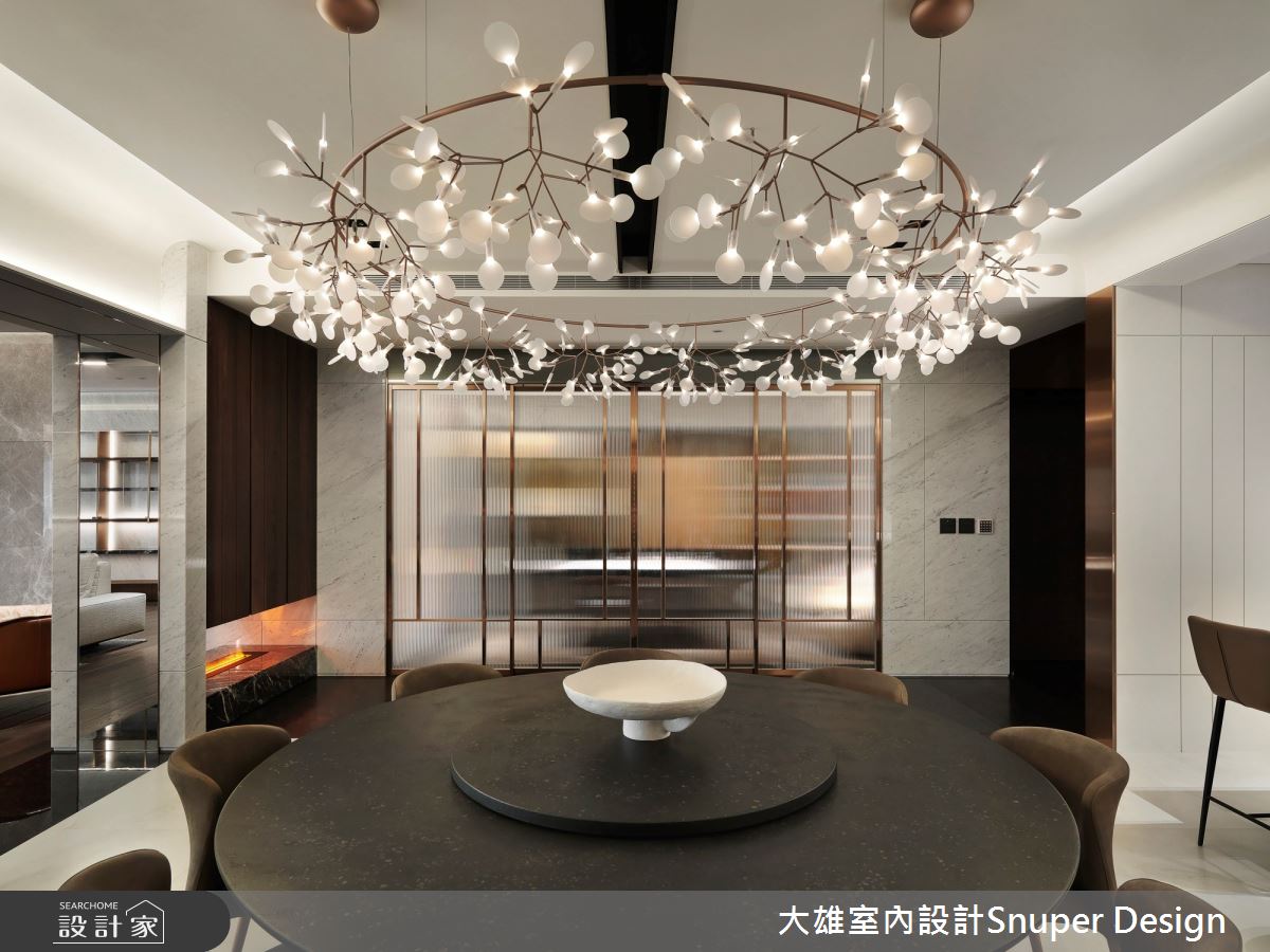 大雄室內設計以油漆、特殊漆、木地板、灰鏡、長虹玻璃、鍍鈦、夾紗玻璃、木作貼皮、大理石、磁磚的搭配應用,呈現現代奢華風居家氛圍,將此間53坪、三房、單層、新古屋(10年以下)打造成舒適愜意的家庭空間,完成2位大人、2位小孩全家人的夢想之居。