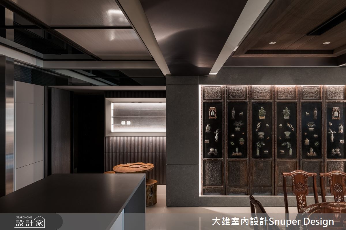 百坪大宅裡,藉由石材、木作為主要材質,大面積堆砌出壯闊氣勢,且結合漸層的立面設計,冷暖元素相兼,豐盈居家美學氛圍。 客廳天花板以立體的木作堆疊,漸層的手法讓空間達到無線蔓延之感,且延伸至後方餐桌區,空間隨即開闊,地板則以大理石鋪設一室,電視牆透過粗獷石材的拼接,擘劃出非凡氣度,而下方與兩側結合木作隔柵造型,材質的細節安排展現設計新意;循著階梯來到餐廚空間,地坪特別換上與客廳不同的石材,自然界定出兩者領域,餐桌、中島的天花板局部貼附鏡面,透過反射的材質特性,讓視覺更為延伸,領域更顯放大;中島後方則以玻璃拉門界定出廚房空間,烹調時可拉上門扇,杜絕油煙溢出的窘況,平時則可將門扇自在打開,讓餐廚空間更顯連貫、一氣呵成,空氣流暢無礙,享受開闊的視線。 小編的最愛 書房的入口處以金屬材質打造門拱造型,自然劃分出內外領域,天花板的中央特別拉高尺度,加上兩側設計開放層板的書櫃造型,即使置身在坪數有限的空間裡也不會讓人感到壓迫。 施工單位: inD’finity Design (m)Sdn. Bhd.