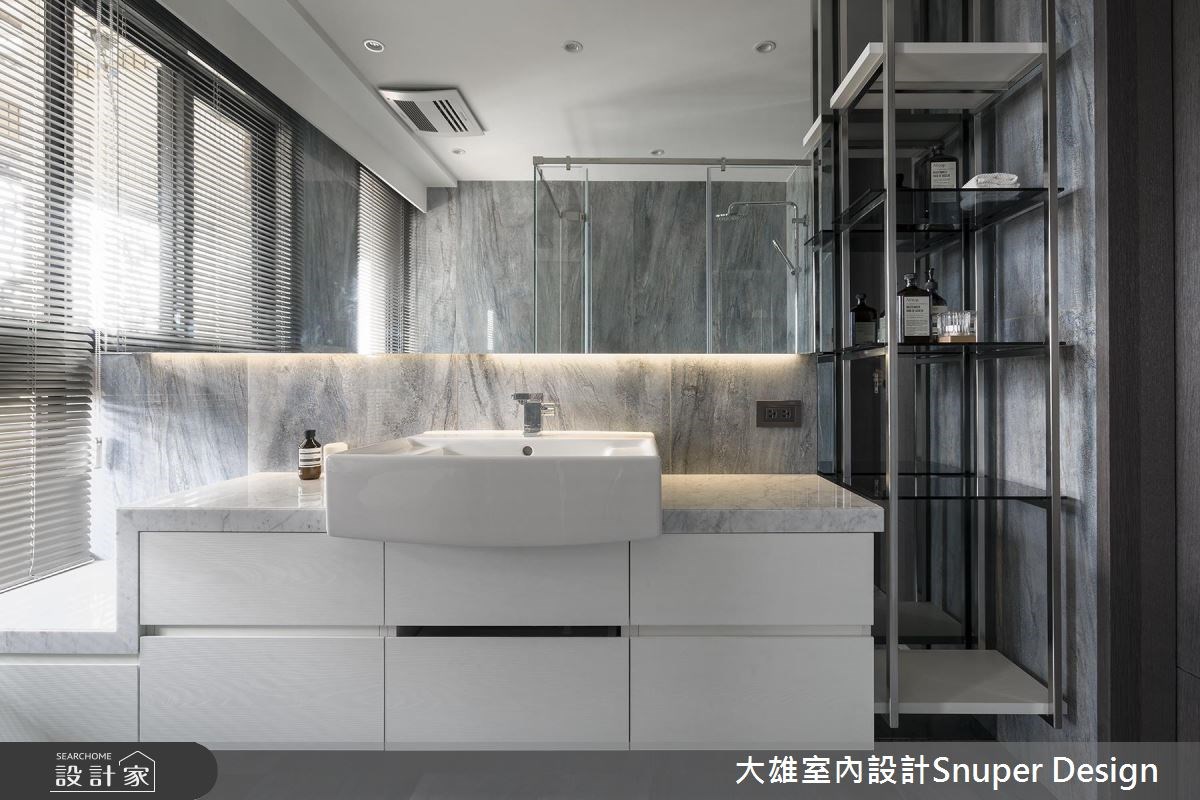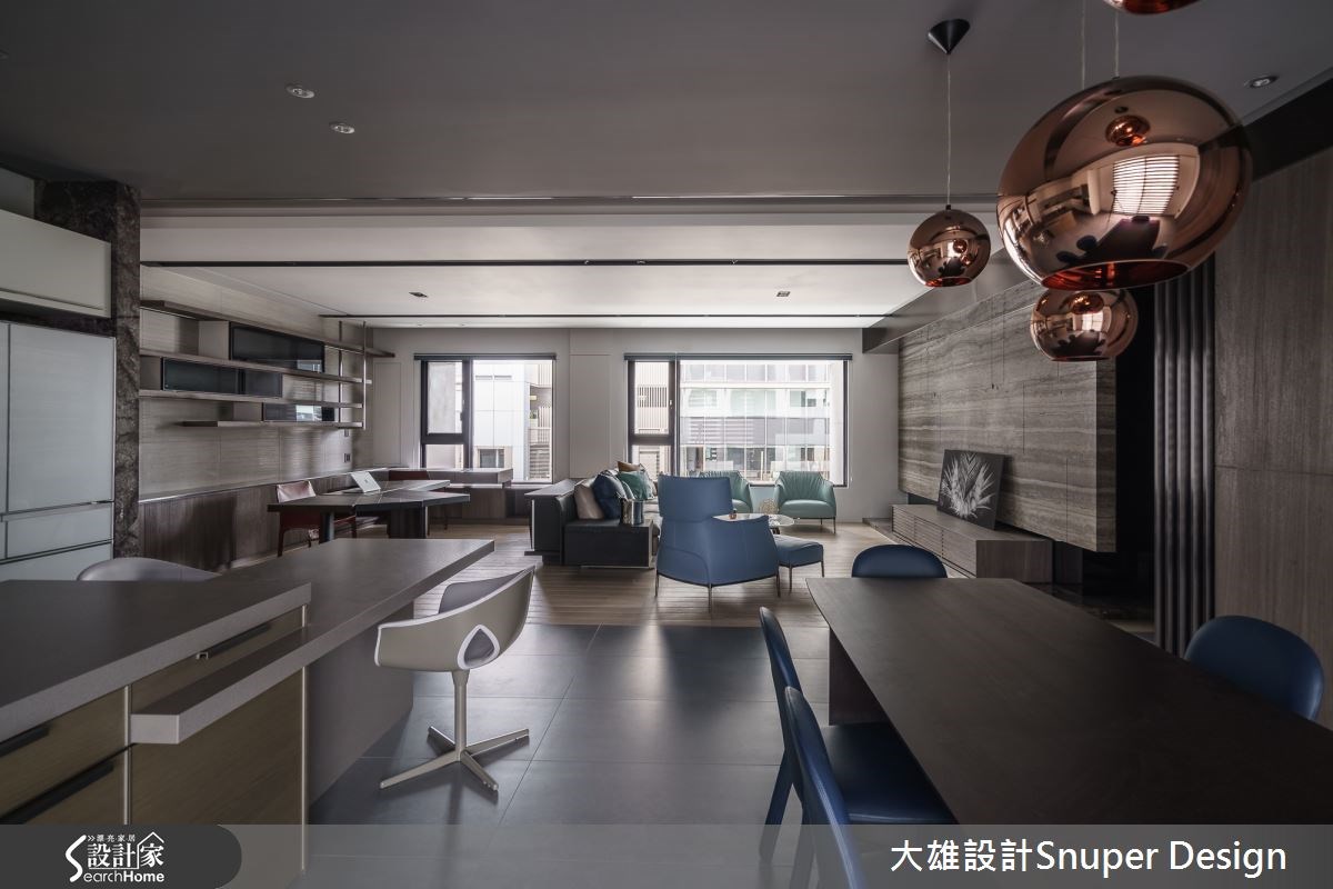 以現代風為設計語彙,藉由最自然的石材、木紋與鐵件元素,勾勒出家最安定、靜謐的表情,加上空間裡利用景深的領域貫穿、開放層架的擺設,形塑彈性且富美學、機能的風尚宅,讓中古屋徹底逆齡重生。 玄關處以騰空的鞋櫃為設計,不落地的方式更顯櫃體輕盈無壓,輕輕轉個彎,就進入整體公領域。大面窗戶將戶外的宜人溫度與光線引入,粗獷感石材拼接電視牆的原始風貌,並留出兩側走道通往私領域,將空間的運用發揮極致;左側壁面規劃展示層架,搭佐嵌燈照明更添人文氛圍;L形沙發的彈性擺設,讓更多親友能共乘在客廳空間裡,彼此交流與互動情誼;沙發後方為臨時書桌區,以簡約的鐵件結構框構出開放展示書牆,不規則的隔間技法活用收納方式,同時創造視覺上的美學層次;書牆的左側以木作拉門界定出私人領域,延續至對面的電視牆右側同樣以木作拉門隔出臥室空間,當兩側門扇全面開啟時,視野更為延伸,空間一展開闊之感。 小編的最愛 餐廚領域以深色調飾底,餐桌與中島串連讓尺度加長,隨著縱向的擺設方位,視覺隨之望向書房後方的落地窗,一覽城市美景,心胸隨之開闊舒心。