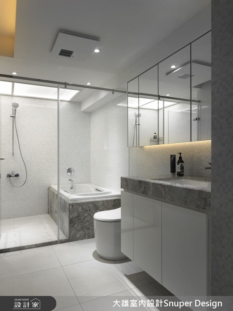 45坪老屋翻新計劃正式啟動!藉由明亮、舒適的現代風格詮釋家居氛圍,大量的白為基底下,灰、木紋色妝點其中,交織出舒適而質感非凡的氣息;延伸屋主收藏的樂高LEGO靈感,在公領域的天花板打造鏡面,視覺反射與延續的虛實感增添戲劇張力,讓空間產生趣味對話。 打破設計想像,公領域的天花板以鏡面打造,虛化結構的手法,消弭低矮的天際感受,且映照出整個空間情境,而隨著戶外光源灑落一室,折射在鏡子上,搭佐整體以白色為基底的質感,賦予室內明亮、純淨的生活氛圍。金屬線條穿梭在石材飾底的電視牆面,隨著光線折射,產生漸層的光影變化,而牆面刻意不做滿的手法,讓出一條通往餐廳的過道,創造領域互動性;藉由異材質層板描繪出展示收納區,簡潔之中更添視覺變化,中央以玻璃展示櫃設計擺放屋主收藏的樂高,增添人文趣味性;餐廳空間裡以餐桌串連中島,原木質感的餐桌替現代感的空間氛圍挹注自然風味,延續鏡面的設計靈感,電器櫃與收納機能的門片皆運用此元素,還利用玻璃拉門界定出餐、廚區,翻折的場景概念讓領域間不斷產生對話,想像持續蔓延。 小編的最愛 簡約、靜白的現代空間裡,利用鏡面的翻折概念突破領域侷限,更營造出寬敞、舒心的器度,而透過木紋妝點則讓家多了份溫潤表情。