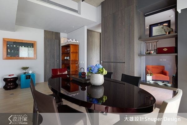 本案為40坪三房兩廳的時尚現代風設計。沉穩低調、開放式的客餐區舒適融洽,以鐵件打造的俐落電視牆令人吸睛,並在展示的座椅上,也以不同特色風格混搭,造就另類的時尚風格卻又如此的融合空間,造型天花板牆面也展現幾何特色,在此可以見到多處具有巧思且繽紛的藝術品擺放,增添了居家設計感,讓生活更加具有樂趣!整體空間混搭中、西素材的設計軟件,不僅造就提升了生活的巧思,也展現屋主人文藝術的一面,透過室內設計的創意,創造了一處嶄新的時尚、大器現代宅。主要建材:梧桐、鐵刀木、不鏽鋼、鐵件、玻璃。