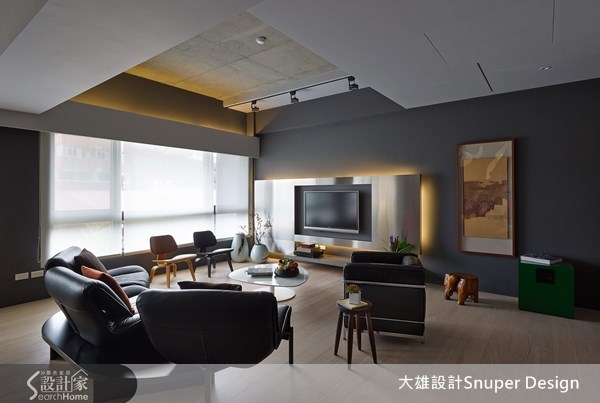 整體空間以現代禪風設計及略帶貴氣的氛圍帶出全室設計,在設計的過程裡將原本不平整的餐廚空間格局重整,用傢具重新配置空間屬性,讓整體看起來寬敞,並將景觀優美的優勢放大;開放式的客廳、餐廳、廚房及書房空間,開啟整面窗景,讓自然綠意成為最適合的藝術品,晝夜變化引領宅第成就最美好想像;開放式的動線讓人不受限原本死板的格局,也可自在地與家人間輕鬆對談,黑色大理石製成的電視牆面為空間帶來沉穩大器感,廊道上以溫潤的櫃體鋪陳,堆疊出家的幸福想像,融出現代低奢感;起居空間依照使用者的特性加以規劃,使用不同柔性的色調揮灑,交織出清爽、鮮明的機能臥房。主要建材:梧桐木、鐵件、噴漆、黑網石、進口板岩磚。
