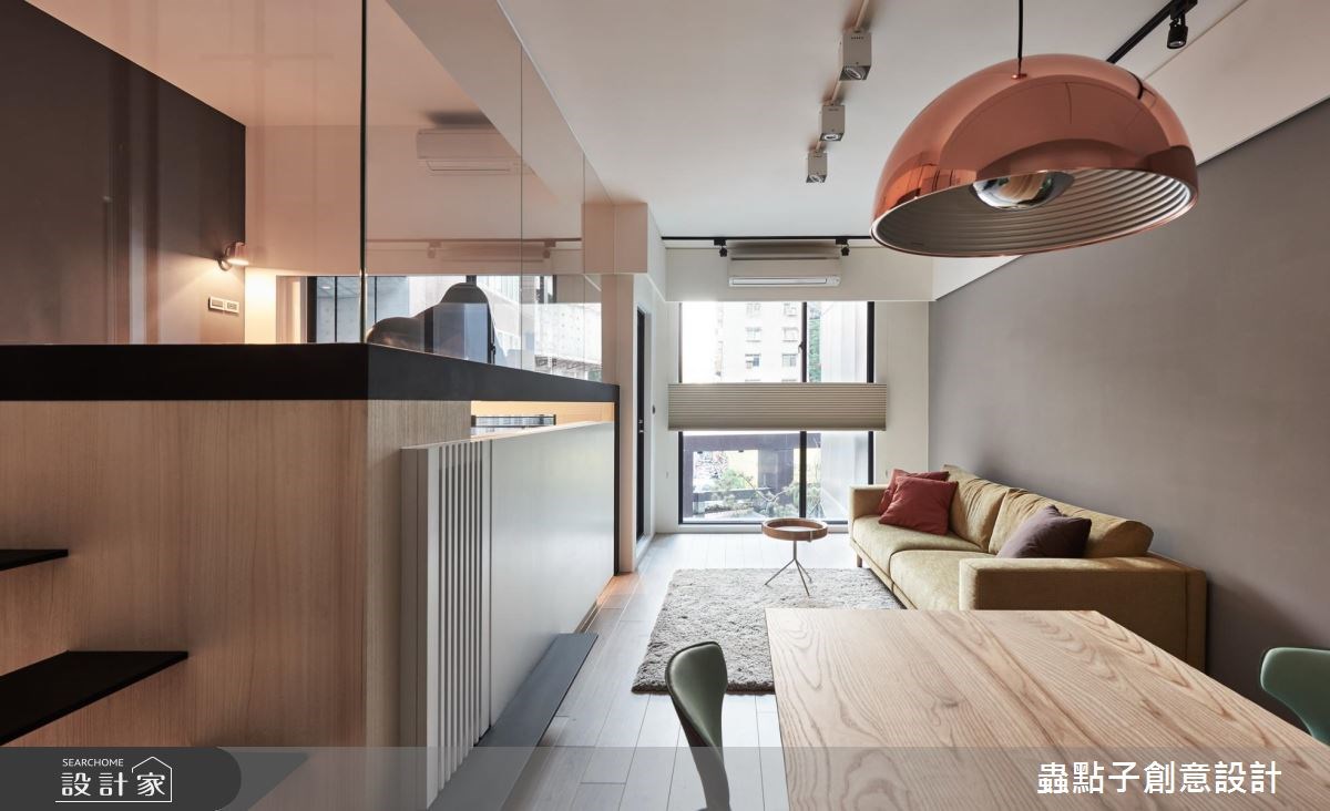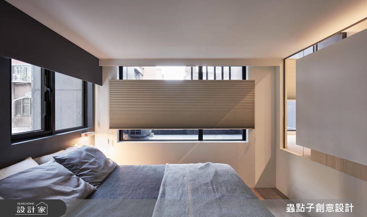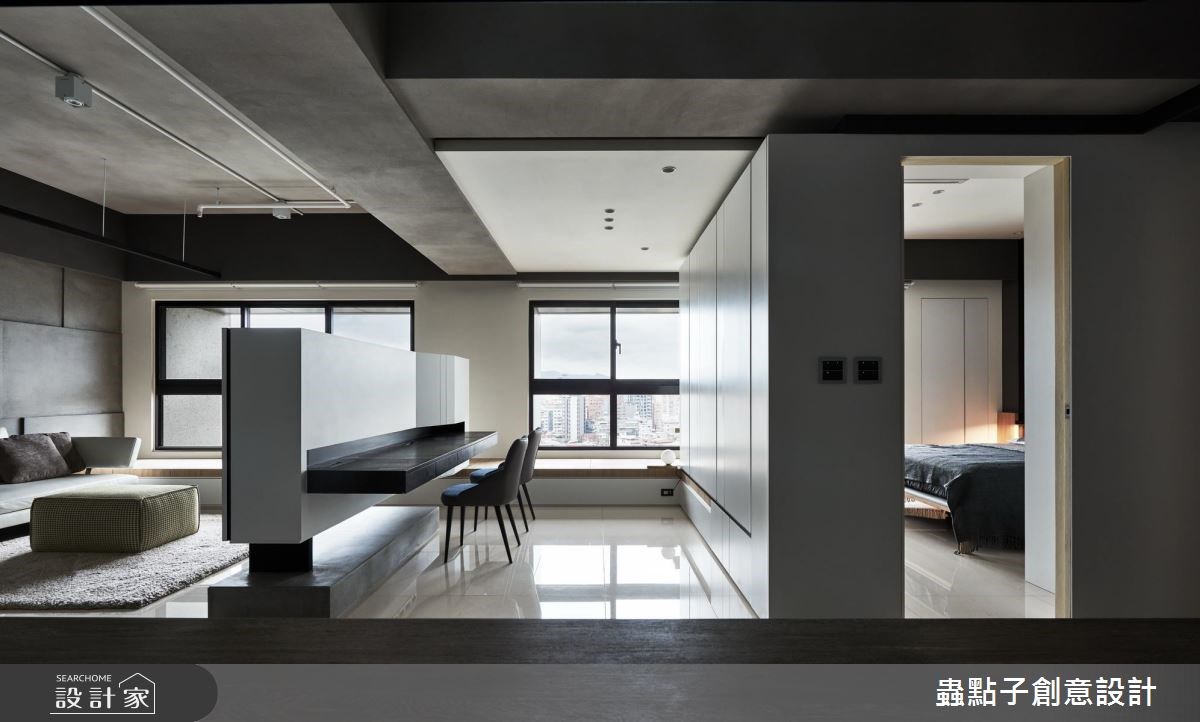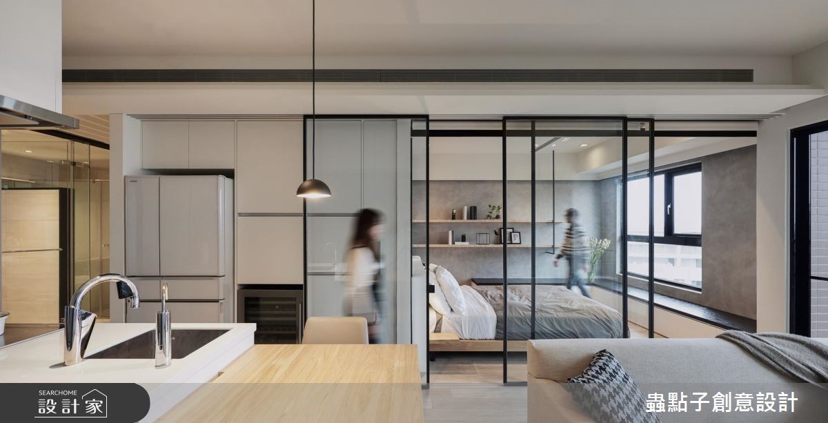 蟲點子創意設計的主持設計師,購置了近郊的 14 坪公寓,雖室內坪數有限,但卻有一個 4 坪大陽台!設計師看見了視野開闊、光線充足的絕佳優勢,將自己的家打造成簡約俐落的設計旅店。 屋案原先的格局並不理想,僅 14 坪的室內空間就被分割為 2 房、 5 個空間,完全無法展現既有優勢。設計師依據自己的需求,以玻璃和霧面拉門取代所有隔間,打造開放式公領域,無論是用餐、工作或招待朋友,皆舒適得宜。由於坪數有限,設計師打破既有框架,將公私領域區分為兩大塊,公共空間放置在陽光充沛的採光面;臥房則基於隱私後移,且最重要的是,「每個空間都擁有兩種以上的複合機能」! 設計師獨鍾「界線模糊」的設計,認為不被定義的格局,才是小空間的最佳規劃方式。當夜幕低垂,設計師的燈光設計巧思才正要啟動,以間接照明點亮個人風格。 小編的最愛 設計師建議,如果坪數有限,盡量以全開放設計為主,他以一面旋轉電視牆與活動式霧面玻璃拉門串聯公私領域空間,巧妙加上地坪落差,達到隨心所欲、開放隱私兼具的動線。
