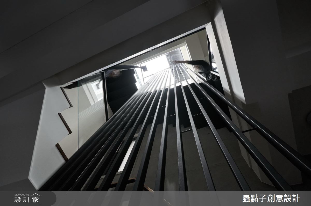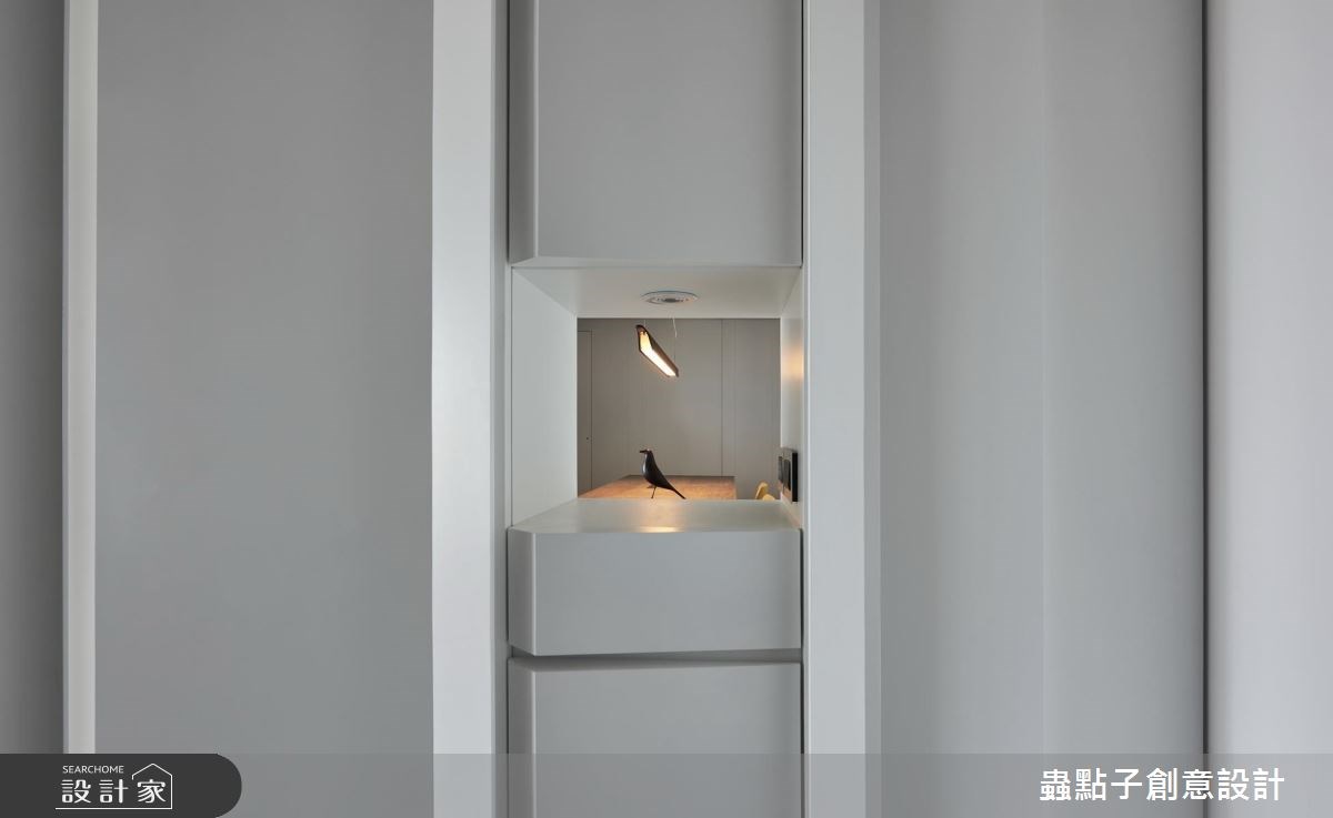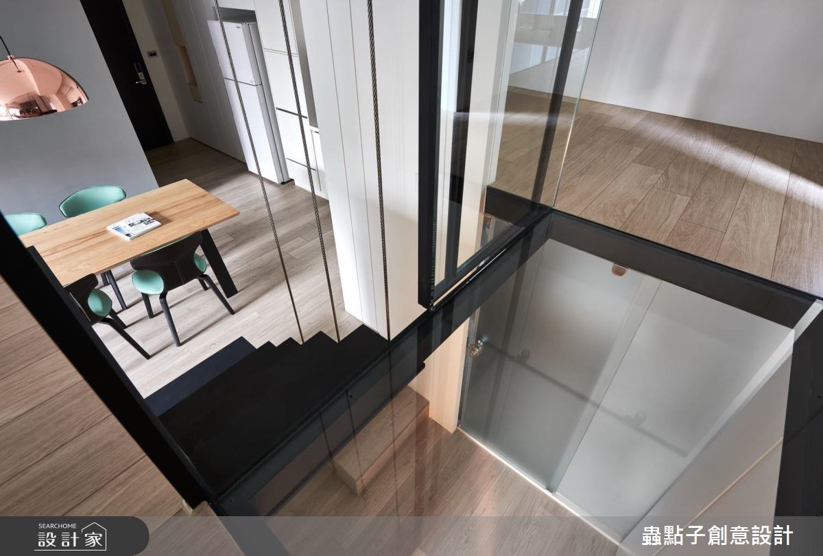 40 坪簡約風住宅,屋主的第一個家同樣委託蟲點子設計,欣賞其不斷突破且考量到居住者需求的設計,因此將第二個家也交由相同專業團隊。設計師以一漂浮於書桌上方的玻璃空間,重新定義單層空間住宅想像,打造出跳脫原有框架的風格。 玄關入口採用石材及灰鏡,呈現較昏暗空間視覺,加深與客廳輕透光感的對比。廚房加裝鐵件拉門設計,可因應機能將廚房獨立於公共空間;餐桌、廚房及中島平行配置動線佳,增加了機能運用。客廳電視牆以一面純淨白色無限延伸視覺,映襯窗邊日光帶出透亮質感。客廳後方則以一櫃體將公領域區隔出多功能休憩區,櫃體上方刻意留空的設計,讓日光、視線暢流於空間,可將拉門關上變身具上下層且保有隱私的多功能客房。從客廳延伸至主臥的陽光臥榻,具備海量收納功能,且巧妙連結公、私空間。主臥區的門片隱形於延伸的臥榻中段,可隨時拉開或關上,讓主臥同樣享有隱私,又能讓客廳與臥房產生意想不到的連結。 小編的最愛 設計師在客廳後方的書房上方區塊中,打造如樹屋般的秘密基地,彷彿在空間中置入一懸空的玻璃光盒,可作為孩子的遊戲區、大人的休憩空間或多功能客房。沿著嵌入LED燈的樓梯,走進以純白色為主的玻璃空間,透過玻璃及留空的縫隙間,光影自然流動於室內,也因為多元有趣的視角,連結了人與人不經意的視線,增進家人間的情感交流。