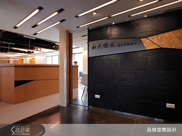 此案為辦公空間,因應辦公需求業主要求如下:兩間主管室、8人以上的辦公空間、15人可同時使用的會議室、洽談接待區、影印室+設備機房、茶水間及大量客戶帳冊資料儲存區等。設計師結合現今建築物裝修管理條例及建築技術規則,用材用料除了符合始用率達45%的綠建材規定外,業主樸實節儉的要求若現有設備可沿用的都盡量不要浪費,所以如何延用舊有設備,又不失讓辦公空間減少現成OA屏風的制式與冰冷感,成為這場設計面具挑戰的地方。為了達到空間寬闊感,長時間的辦公區屏除掉複雜的天花板,採用裸露原建築結構方式,讓樓高不是很高的建條件下有向上延伸的空闊感,處理手法也運用在引光與空間界定及延伸上。大型辦公空間界定採用透光材質的固定玻璃加鐵件噴烤漆處理,一方面界定空間,一方面將大面採光引導到辦公區,減少大量燈光使用也讓空間更寬廣。完成所有需求後,運用溫潤的木質定向纖維板、栓木皮妝點空間,營造出悠然自得的休閒感。主要建材:銅鏽石英磚、天然版岩、定向纖維板、栓木皮、玻璃、鐵件等。裝修費用:300~399萬。
