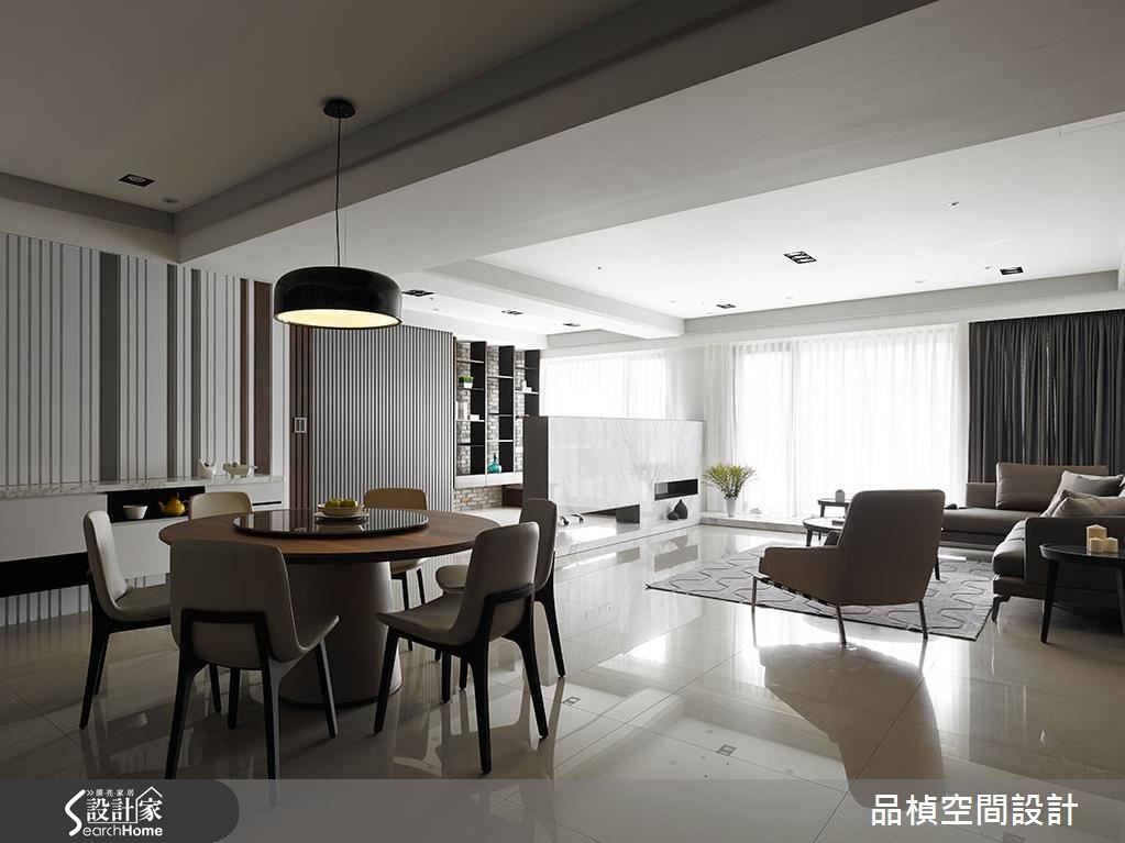 品楨空間設計以木紋磚、大理石、珪藻土、茶鏡、木作的搭配應用,呈現現代風居家氛圍,將此間45坪、三房、單層、新成屋(5年以下)打造成舒適愜意的家庭空間,完成全家人的夢想之居。