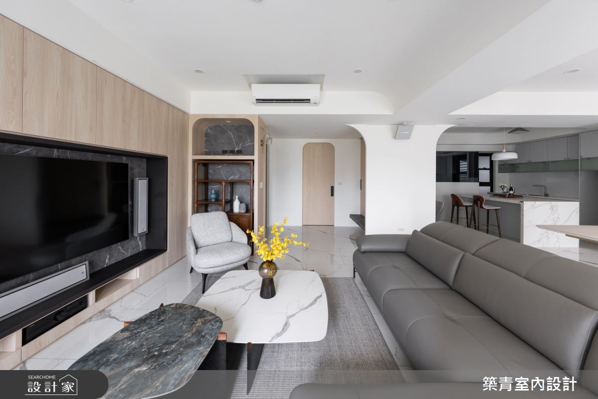 由築青室內裝修精心規劃的35坪三房住宅空間。因應屋主需求,設計師運用混搭風作為主軸,搭配人造石、KD栓木鋼刷木皮、系統櫃、Spiver義大利藝術塗料,打造全家人的夢想家居。
