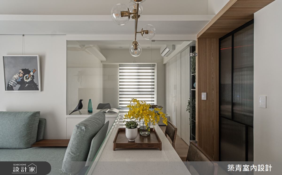 來自築青室內裝修的35坪現代北歐風住宅案,屋主一家人共有2位大人、1位小孩,是一間單層預售屋的三房格局,設計師藉由建材以乳膠漆、木地板、KD栓木鋼刷木皮、黑玻璃、長虹玻璃、系統櫃的搭配應用,實現一家人的理想生活。