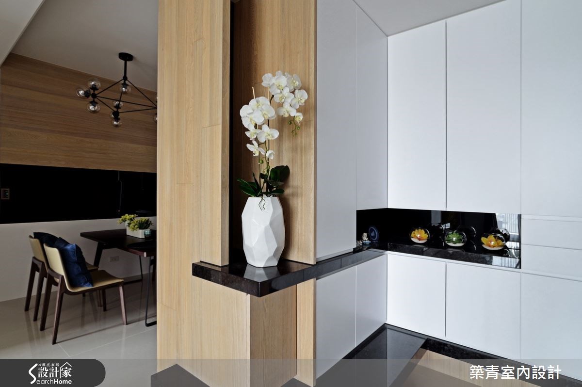設計師將預售毛胚屋利用黑白線條無限延伸,為公領域打造寬廣開闊的視野,並將俐落與溫馨元素妥善融合,除串聯居家場域,更整合零碎空間,達成功能與情感兼具的療癒系宅邸。 玄關大面積櫃體緩坡上升,與電視櫃巧妙結合,屏除傳統收納櫃的制式標準,以幾何稜角呈現獨特且延續的節奏。天花俐落明快的黑白線條成為客、餐廳之間的連結,後方開放式書房與廚房空間則以實木皮天花包覆,並向下延伸至餐廳壁面,與廁所的隱藏式門片及收納櫃的材質相互鏈結,做出場域分隔與層次營造,產生多元的的延續效果。特別將玄關木皮凹槽間加入薄板岩,整合電子設備與開關,讓視覺不顯突兀;更善用毛胚屋既有的原始凹凸牆面,進行櫃體的編排與設計,將客房轉換為書櫃利用,並準確進行空間劃分,破除原先空間不足的缺失,讓走道化為開放書房。吧台與走道間的緩衝區域,讓廚房空間形成獨立小角落,讓視覺顯得乾淨清爽。 小編的最愛 乾溼分離的寬敞衛浴讓居住者可以放鬆地享受不可多得的紓壓空間,牆壁與地面皆鋪設薄岩質感磁磚,予人大器沉靜的衛浴環境。