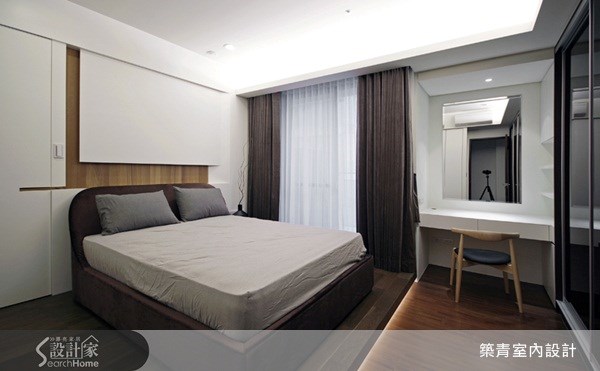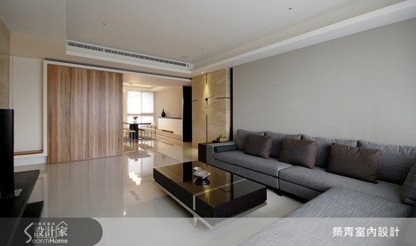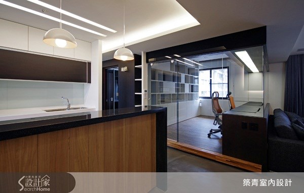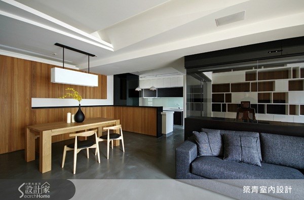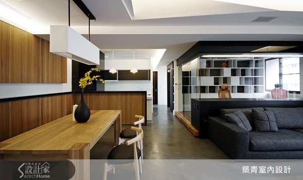 本案屋主是一位年輕的業餘DJ,工作之餘喜歡和朋友一起切磋DJ技巧,他希望生活空間不要只是由一般水平垂直的正交元素來構成,而是充滿了幾何律動的音樂空間,藉由多層次的動態空間氛圍,來啟發他豐沛的創作靈感。 所以在天花和櫃體的造型設計上,就採用了一系列的斜面折板來貫穿整個空間,由櫃子延伸至天花,再轉折到電視檯面。折板的材料大多採用白色烤漆,如此才能形塑出更銳利的幾何光影變化;另外,也採用了大量的玻璃鏡面元素,一方面讓空間延伸擴大,一方面也帶入一些夜店的情境。 因為是屋主一個人的單身空間,所以整體的空間規劃以開放、彈性為主軸。主臥室和客廳間的隔牆,以玻璃材質取代了實牆,可保有空間的通透完整性,但也能視需求而啟動電動捲簾,區隔出臥室的私密性。 另一間架高的和室,則提供了屋主不同情境的休憩空間,這裡有臥榻、升降桌、吧檯,為好客且喜歡夜店氛圍的屋主,營造了一個可以多功能使用的彈性空間。主要建材:白色烤漆、灰色烤漆、黑烤漆玻璃、黑鏡、灰鏡、人造石、萊姆灰木皮、黑色木地板。裝修費用:101~199萬。