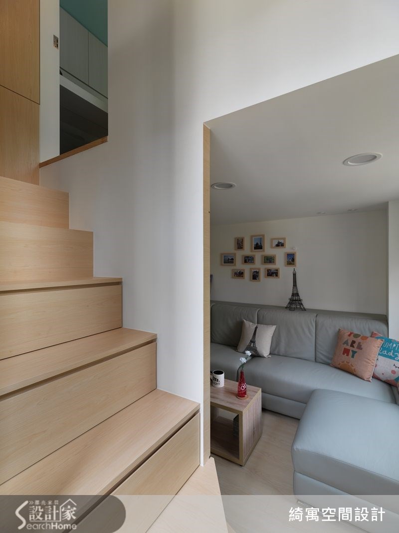 年輕夫妻在台北市文山區買下 12 坪小宅,設計師發揮創意巧思,透過夾層劃規劃出 2 房 2 廳,讓小宅也能擁有客廳、餐廚空間與兩間臥房,格局超完善,並點綴採光、色彩等元素,注入北歐風的品味質感,建構出都市小資族夢寐以求的居宅! 一進入這個家,迎面而來的是開放式餐廳,架高的地板檯面以色彩牆面作為背景,天空藍展現出自由輕盈的視覺感,延伸入內則可進入廚房區域,將冰箱推入牆面,節省不少地坪空間;順著階梯往下,可來到客廳領域,因天花板較高,可設計夾層,透過窗戶引進陽光與綠意,讓視覺可向戶外延伸,緩解格局壓迫,同時在大片木作電視牆後方配置收納空間,滿足機能需求;臥房空間以木作拉門作為彈性的空間界定,關上時則與電視牆結合成完整立面,並在牆面銜接層板、懸吊燈飾,構成了簡約卻實用的置物檯面;沿樓梯往上還設立了閱讀空間,運用清玻璃媒材,讓視線由上往下一覽無遺! 小宅放大關鍵x 2: 1.因天花板有高低落差,設計師將陽台往外推,靠夾層形成 3 層樓空間,讓小宅也能擁有完整機能。 2.透過大面積玻璃窗引入充裕採光,引景入室,並在壁面點綴輕盈亮感的色彩,打造較為開闊的明亮氛圍。