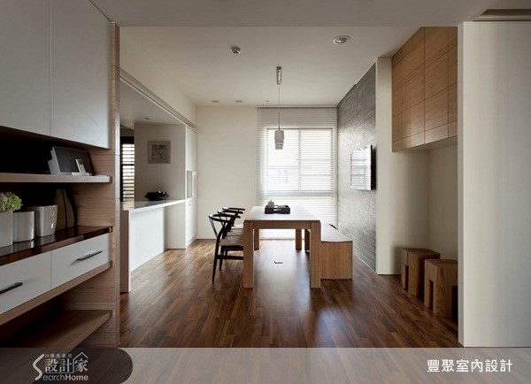 本案位於台中市區,45坪的空間,屋主夫妻與2個小孩居住。由於家裡大大小小東西非常多,因此收納非常重要,但又不希望看起來到處都是櫃子,因此設計師規劃上安排了多處收納,包括衣帽間與沙發後的收納空間。電視牆面乾淨與質的表現是設計訴求,需要的電器與後面的書櫃整合一起,甚至電視牆裡也隱藏了軌道門,可作為空間調整與應用。此外,書櫃不只是書櫃,也可以是塗鴉牆,小朋友可以盡情揮灑又不會挨罵!另一方面,衣櫃門片整合了浴室突兀的門片,捨去全部木皮的繁,而貼了特殊壁紙,讓主臥輕了,也更柔了!裝修費用:200~299萬。