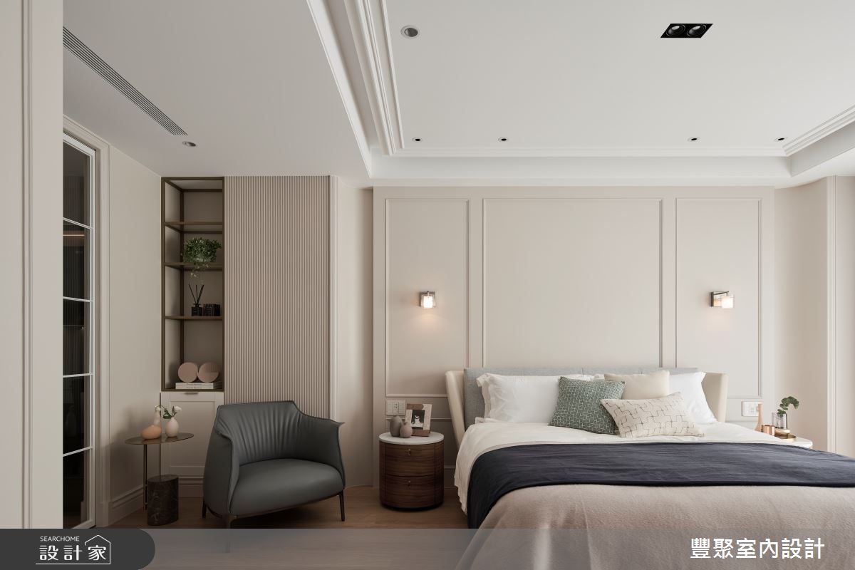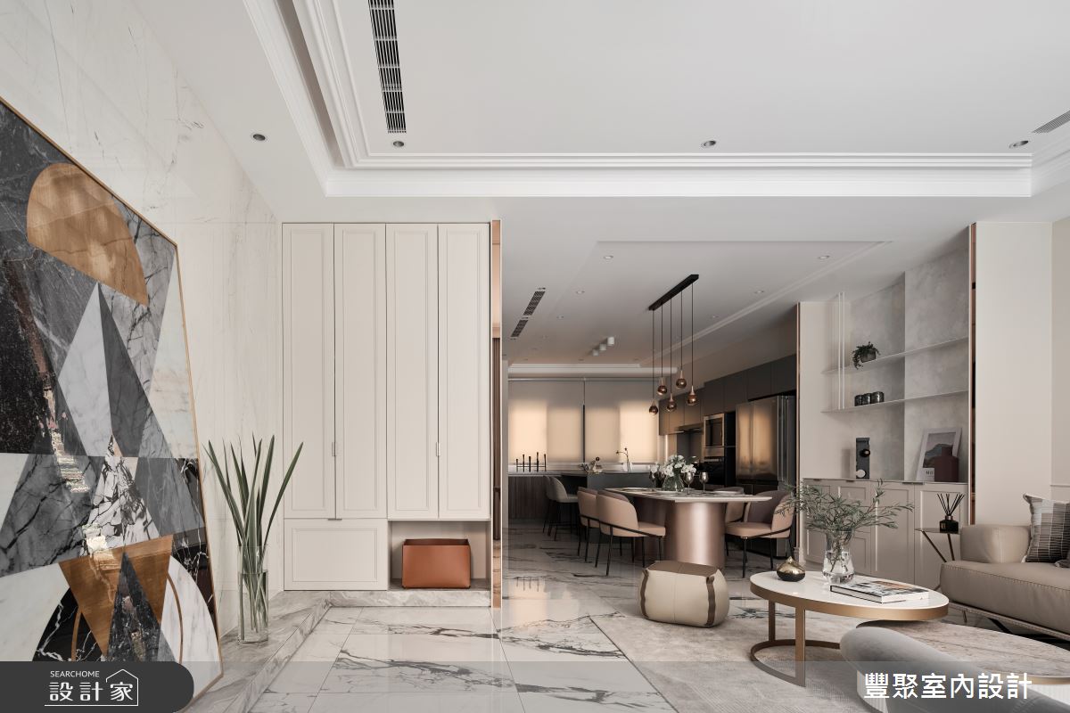 豐聚室內設計以乳膠漆、超耐磨木地板、鐵件、灰鏡、鍍鈦金屬、烤漆、系統板材、木百葉、軌道燈、石材、線板、訂製家具、進口五金、旋轉鞋架的搭配應用,呈現美式風居家氛圍,將此間38坪、兩房、單層、新成屋(5年以下)打造成舒適愜意的家庭空間,完成1位大人的夢想之居。