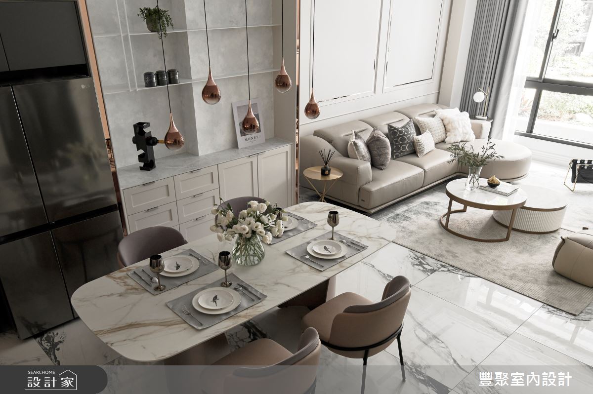 豐聚室內設計以乳膠漆、超耐磨木地板、鐵件、烤玻、鍍鈦金屬、烤漆、系統板材、大理石、木百葉、人造石、軌道燈、線板、茶鏡、訂製家具、烤漆玻璃、小冰柱、磁吸軌道的搭配應用,呈現美式風居家氛圍,將此間35坪、兩房、單層、新成屋(5年以下)打造成舒適愜意的家庭空間,完成1位大人全家人的夢想之居。