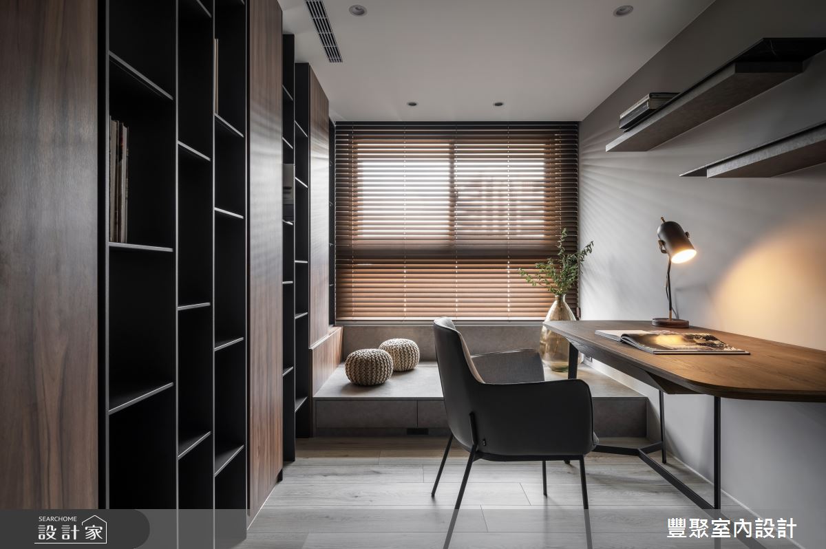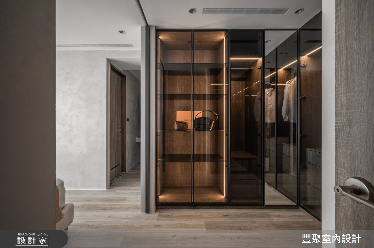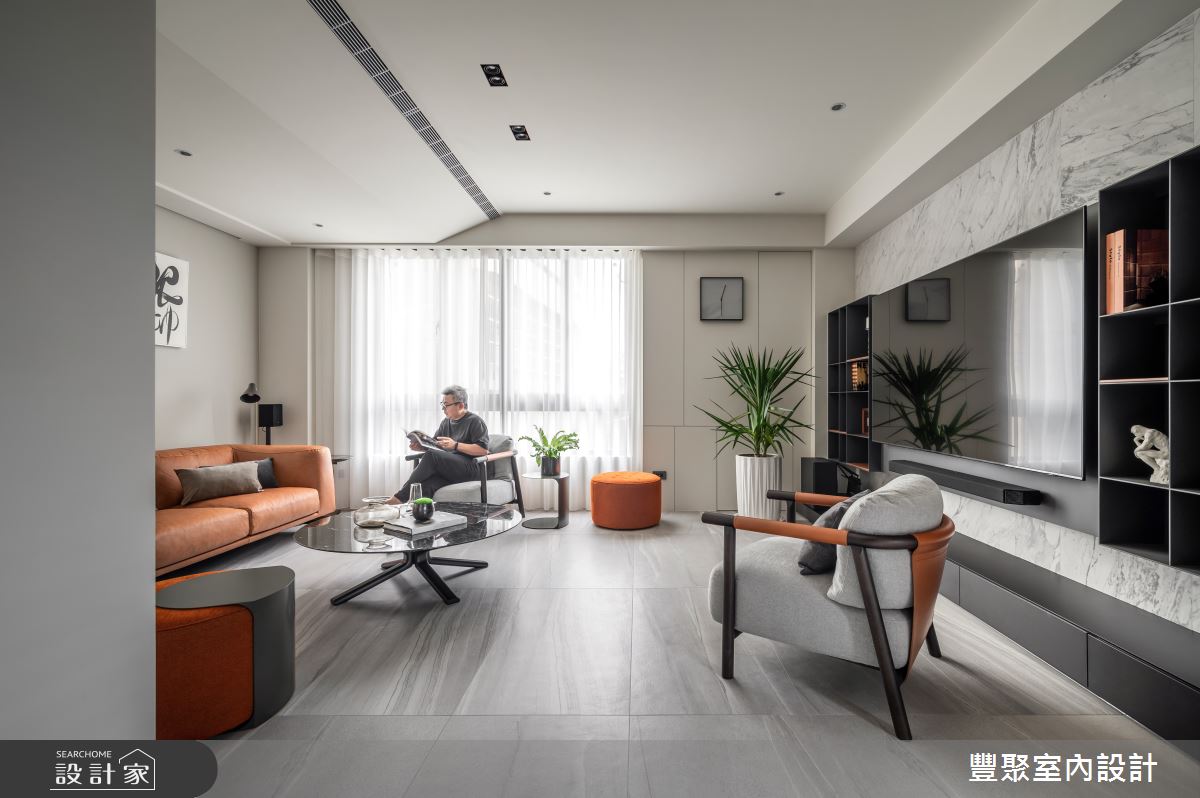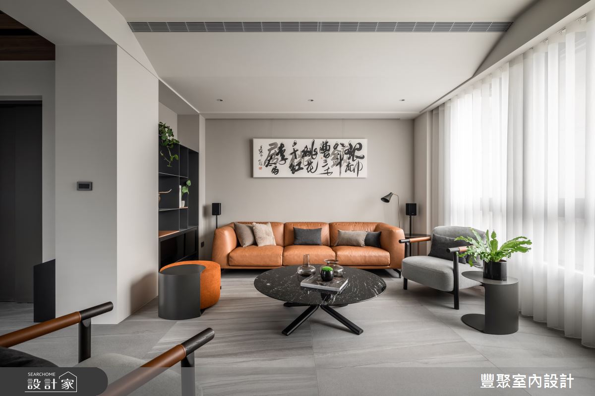 豐聚室內設計以乳膠漆、超耐磨木地板、鐵件、灰鏡、烤玻、鍍鈦金屬、烤漆、系統板材、磁磚、無醛屋、小冰柱玻璃、調濕壁板、訂製家具、全熱交換、燈具的搭配應用,呈現現代風居家氛圍,將此間28坪、一房、單層、預售屋打造成舒適愜意的家庭空間,完成1位大人的夢想之居。