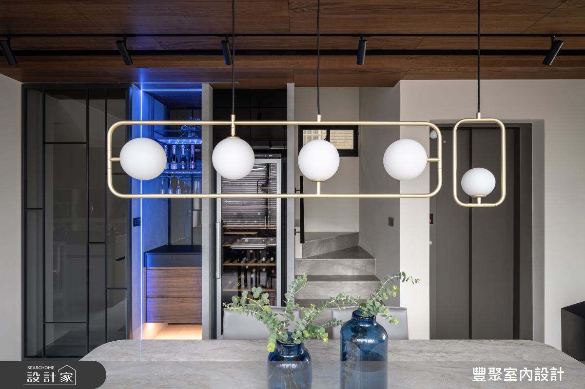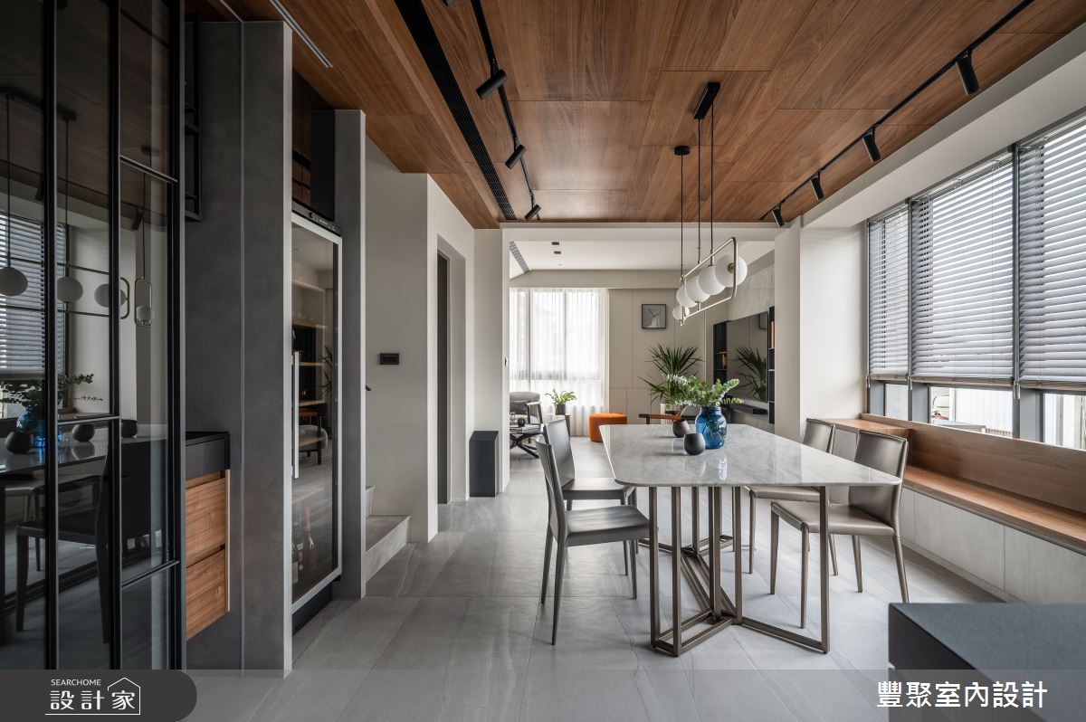 來自豐聚室內設計的95坪現代風住宅案,屋主一家人共有2位大人、3位小孩,是一間透天別墅毛胚屋的四房格局,設計師藉由建材以乳膠漆、超耐磨木地板、鐵件、灰鏡、茶玻、烤玻、鍍鈦金屬、木作貼皮、烤漆、鋼刷木皮、系統板材、大理石、磁磚、木百葉、人造石、賽麗石、軌道燈、石材、線板、噴漆、帝通石、小冰柱玻璃、調濕壁板、訂製家具、薄板磚、貼膜、玻璃磚、波龍、編織毯的搭配應用,實現一家人的理想生活。