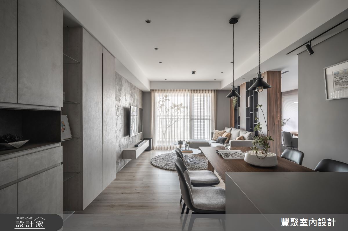 來自豐聚室內設計的26坪現代風住宅案,屋主一家人共有2位大人,是一間單層新成屋(5年以下)的兩房格局,設計師藉由建材以乳膠漆、超耐磨木地板、PVC地板、鐵件、茶玻、鍍鈦金屬、系統板材、大理石、調濕壁板、無醛屋、風琴簾、義大利特殊漆、訂製家具、旋轉鞋架的搭配應用,實現一家人的理想生活。