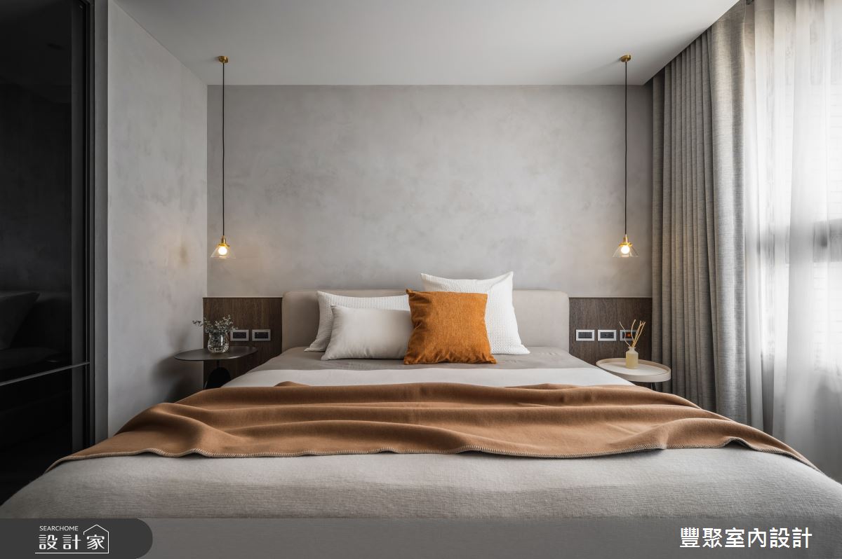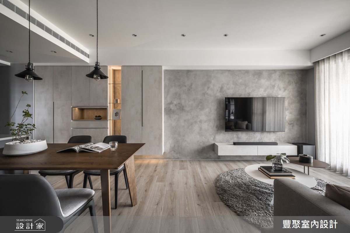豐聚室內設計以乳膠漆、超耐磨木地板、榻榻米、鐵件、灰鏡、烤玻、鍍鈦金屬、烤漆、系統板材、磁磚、軌道燈、無醛屋、小冰柱玻璃、調濕壁板、訂製家具、線型燈、薄板磚、全熱交換的搭配應用,呈現現代風居家氛圍,將此間30坪、三房、單層、預售屋打造成舒適愜意的家庭空間,完成2位大人、2位小孩全家人的夢想之居。