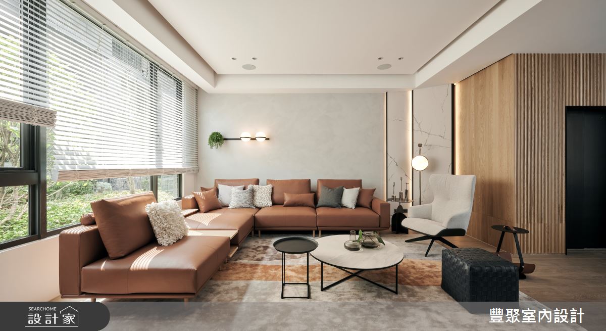 豐聚室內設計以乳膠漆、海島型木地板、鐵件、茶玻、鍍鈦金屬、木作貼皮、烤漆、鋼刷木皮、系統板材、大理石、磁磚、木百葉、皮革、石材、繃布、線板、調濕壁板、薄板磚、特殊漆、風琴簾、強化玻璃的搭配應用,呈現現代風居家氛圍,將此間46坪、三房、單層、新成屋(5年以下)打造成舒適愜意的家庭空間,完成2位大人、3位小孩全家人的夢想之居。