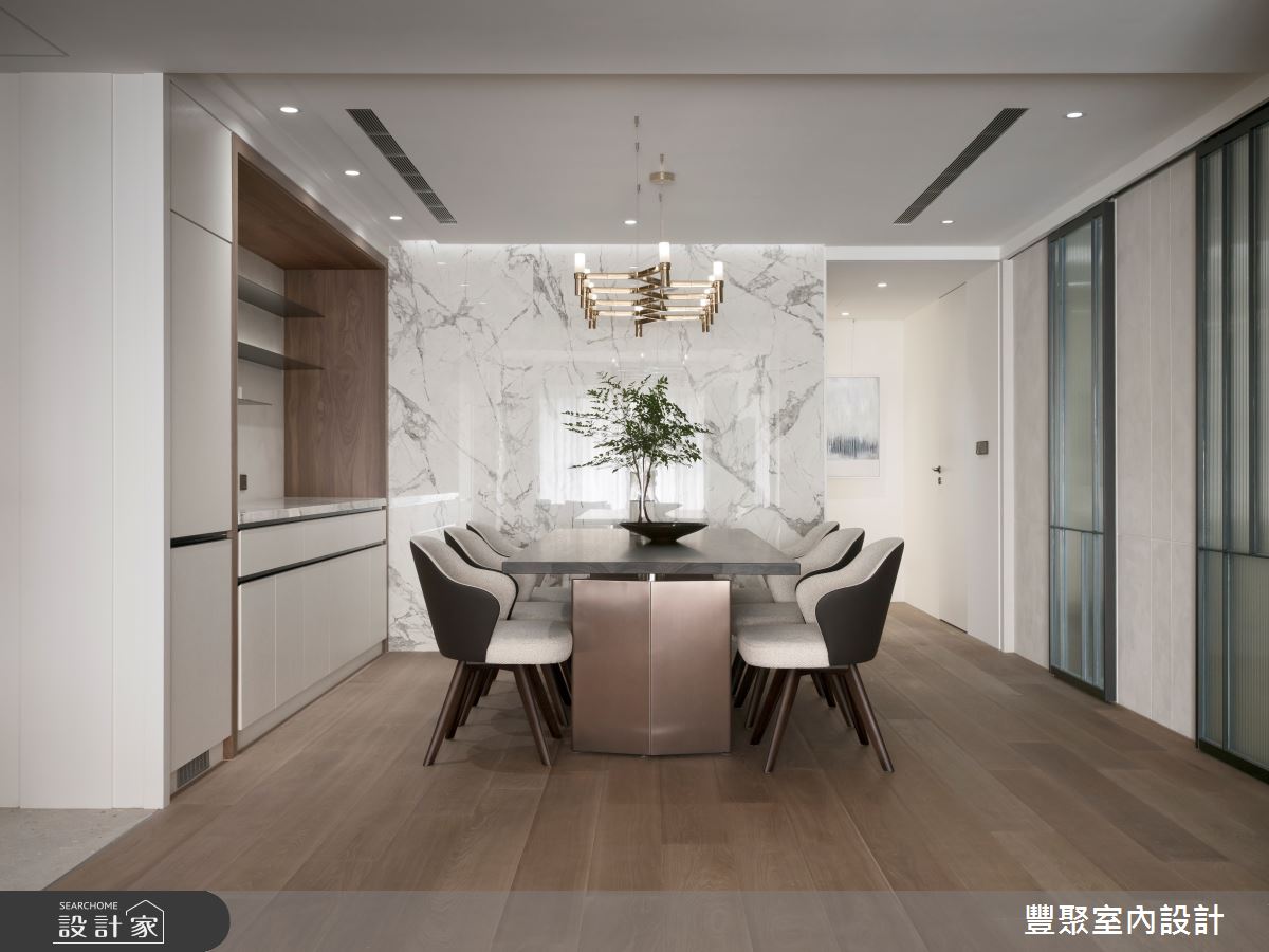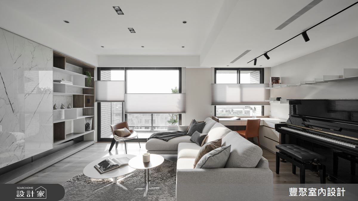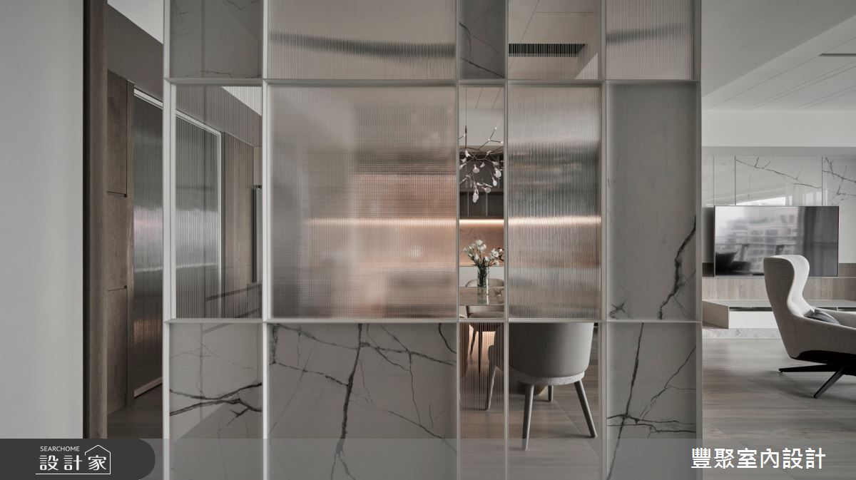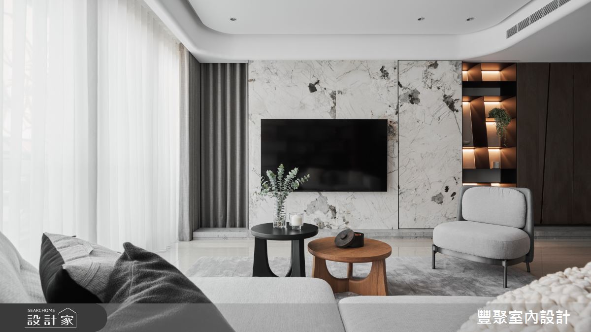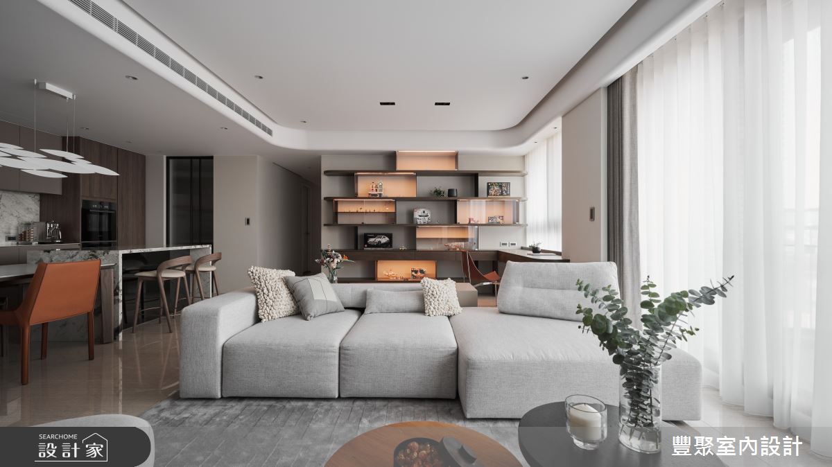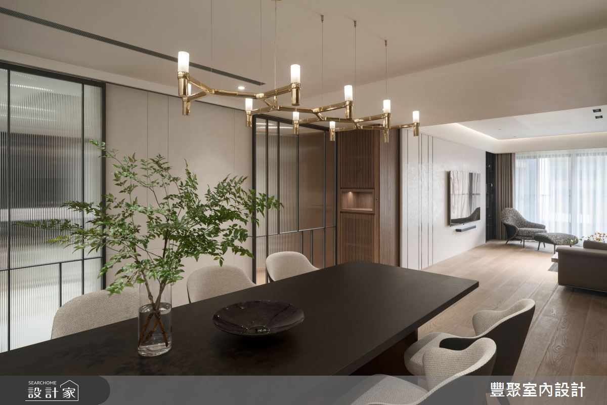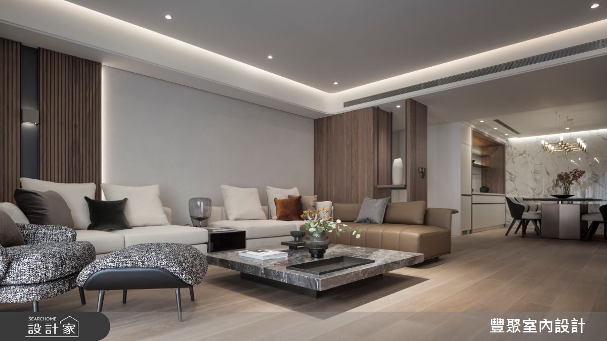 由豐聚室內設計精心規劃的44坪三房住宅空間,家庭成員一共有2位大人、2位小孩。因應屋主需求,設計師運用現代風作為主軸,搭配大板磚、石材、鍍鈦、訂製鐵件、長虹玻璃、白橡、染色實木、小冰柱玻璃、義大利進口特殊漆、進口系統櫃板材、訂製家具、無醛屋,打造全家人的夢想家居。