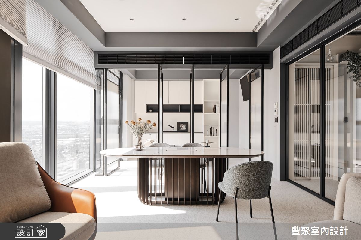 由豐聚室內設計精心規劃的56坪商業空間,因應業主需求,設計師運用現代風作為主軸,搭配建材乳膠漆、PVC地板、鐵件、灰鏡、烤玻、鍍鈦金屬、烤漆、系統板材、人造石、軌道燈、繃布、風琴簾、無醛屋,打造精緻品味的空間氛圍。