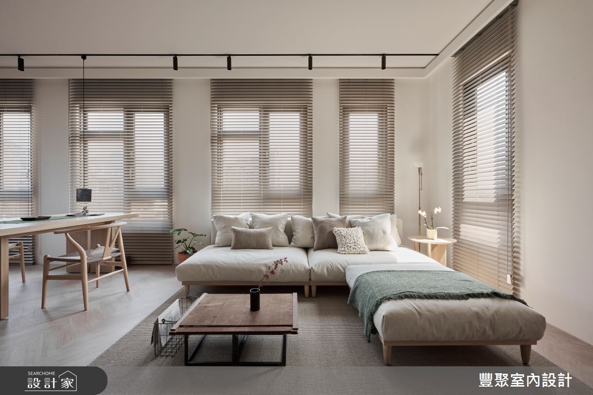 豐聚室內設計以乳膠漆、超耐磨木地板、鐵件、灰鏡、烤玻、鍍鈦金屬、木作貼皮、烤漆、鋼刷木皮、系統板材、大理石、磁磚、人造石、石材、繃布、調濕壁板、無醛屋、帝通石、薄板磚、特殊漆、風琴簾、強化玻璃、燈具的搭配應用,呈現現代風居家氛圍,將此間47坪、兩房、單層、中古屋(5~15年)打造成舒適愜意的家庭空間,完成2位大人、2位小孩全家人的夢想之居。