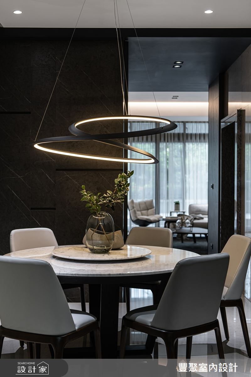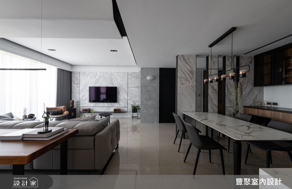 來自豐聚室內設計的100坪現代風住宅案,屋主一家人共有2位大人、3位小孩、1位長輩,是一間複層新成屋(5年以下)的四房格局,設計師藉由建材以義大利進口特殊漆、鍍鈦、鐵件、雕刻白大理石、金屬飾網、白橡木自然批木皮的搭配應用,實現一家人的理想生活。